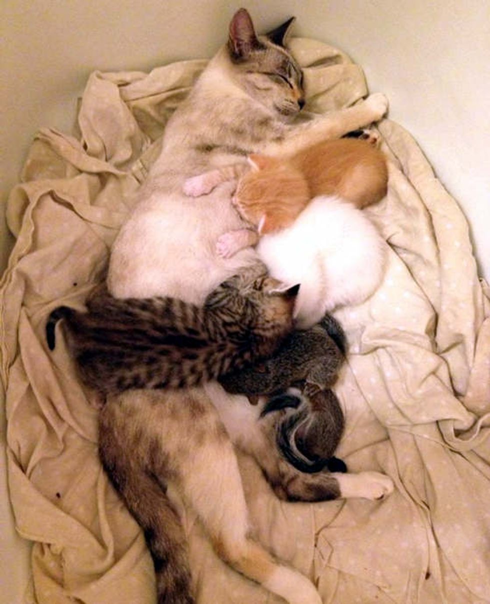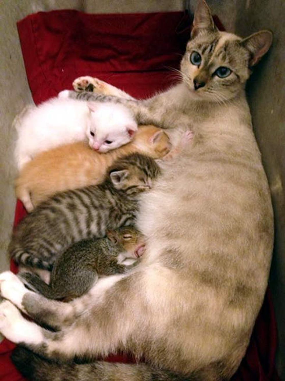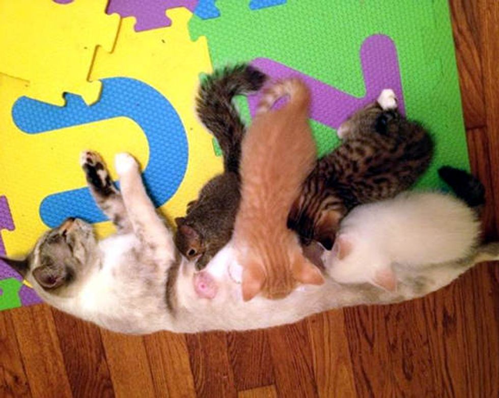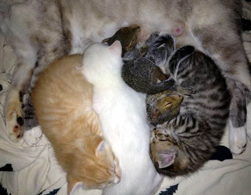 A mother cat who just gave birth adopted two orphan baby squirrels. "We found a baby squirrel under our porch with no signs of a mother. He was shivering and barely breathing. We took him inside," the human wrote via reddit. After consulting the vet, they put the little squirrel next to the mother cat, hoping she would accept it. It didn't take long for the cat mama to notice the little baby squirrel. She immediately took it into her care and started nursing it along with her own kittens.