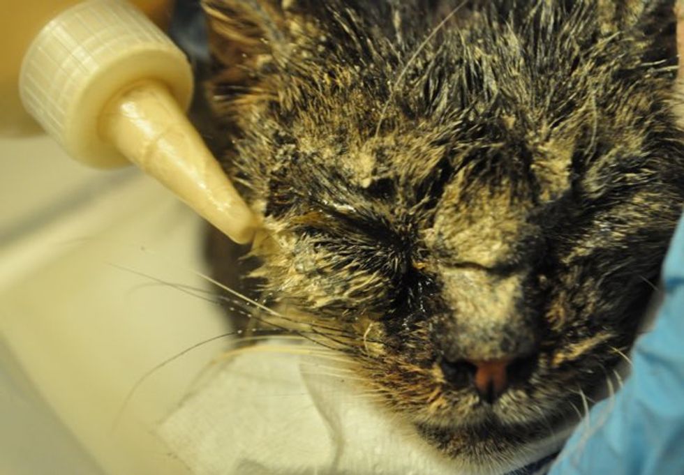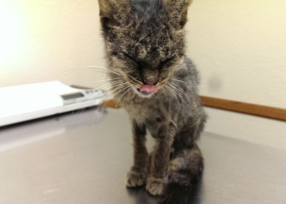 They took the cat to the vet the next day. "The cat was in very poor health and severely underweight, but we knew surrendering him to the shelter would only result in him being euthanized," they wrote. "There were many problems with the him besides the obvious malnutrition, fleas, and dehydration. A severe scabie and mite infestation made him vulnerable to bacterial infection and as a result his eyes were infected and sealed. There were also skin infections caused by lacerations probably from other animals."