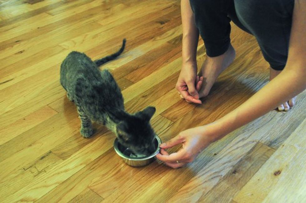 "We took Mr. Cat out to our living room for the first time. A few sardines to get him acquainted outside of the quarantine zone seems to work rather well."