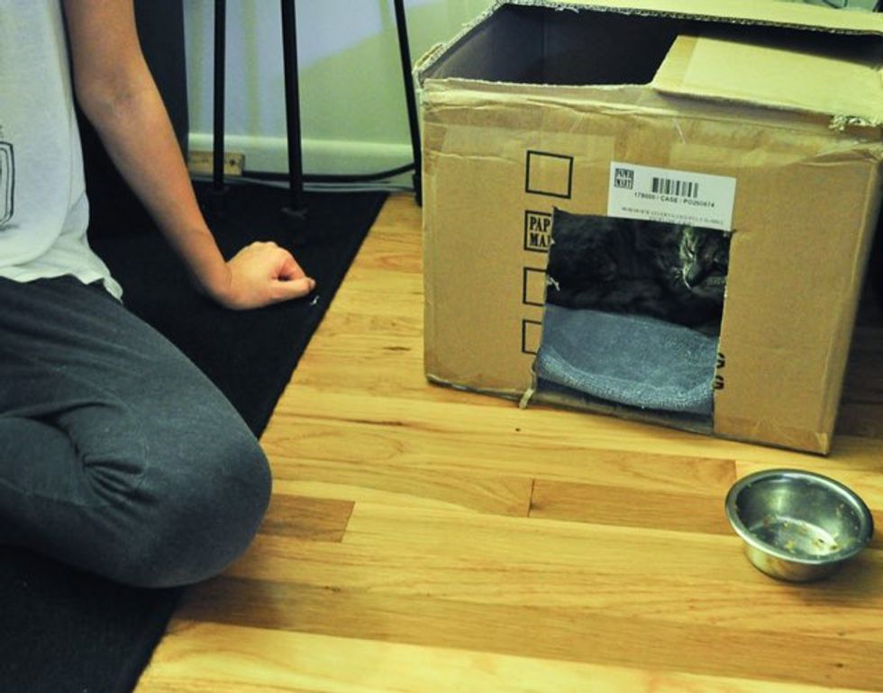 "Mr. Cat has so strongly associated safety with his box that we created a second vacation home for him outside of the ward. He immediately walks in and makes himself comfortable."