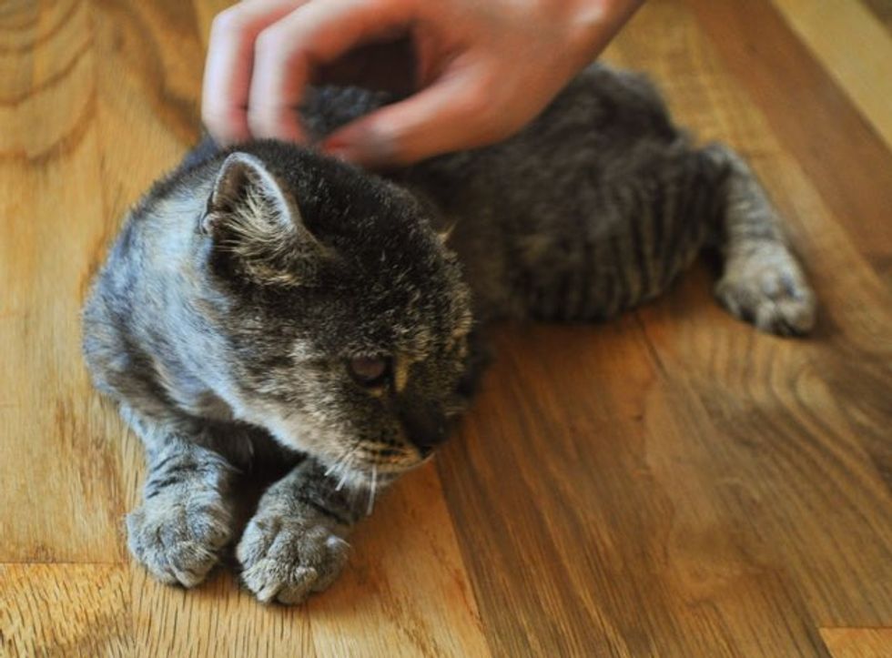 "While heading to my car, my colleague and I discovered a small furry thing plopped on the grass near where I worked. When we went up to inspect it, we discovered that it was an emaciated, blind, and dying kitten, much less than a year old. We were able to coax it to slowly get up and walk a few meters where it stopped. My colleague brought a can of cat food and fed it a portion while gently petting it's skeleton-like frame."