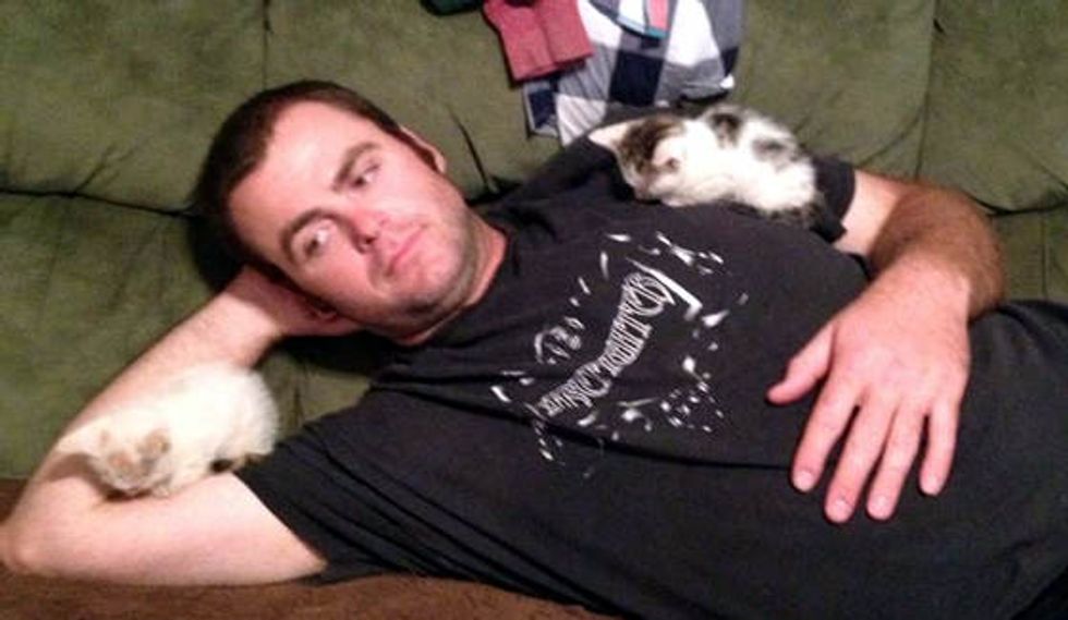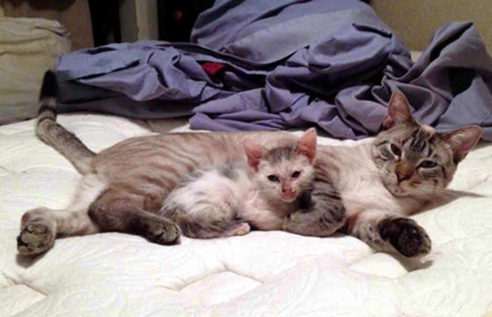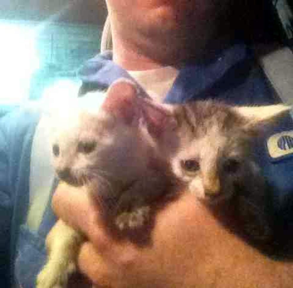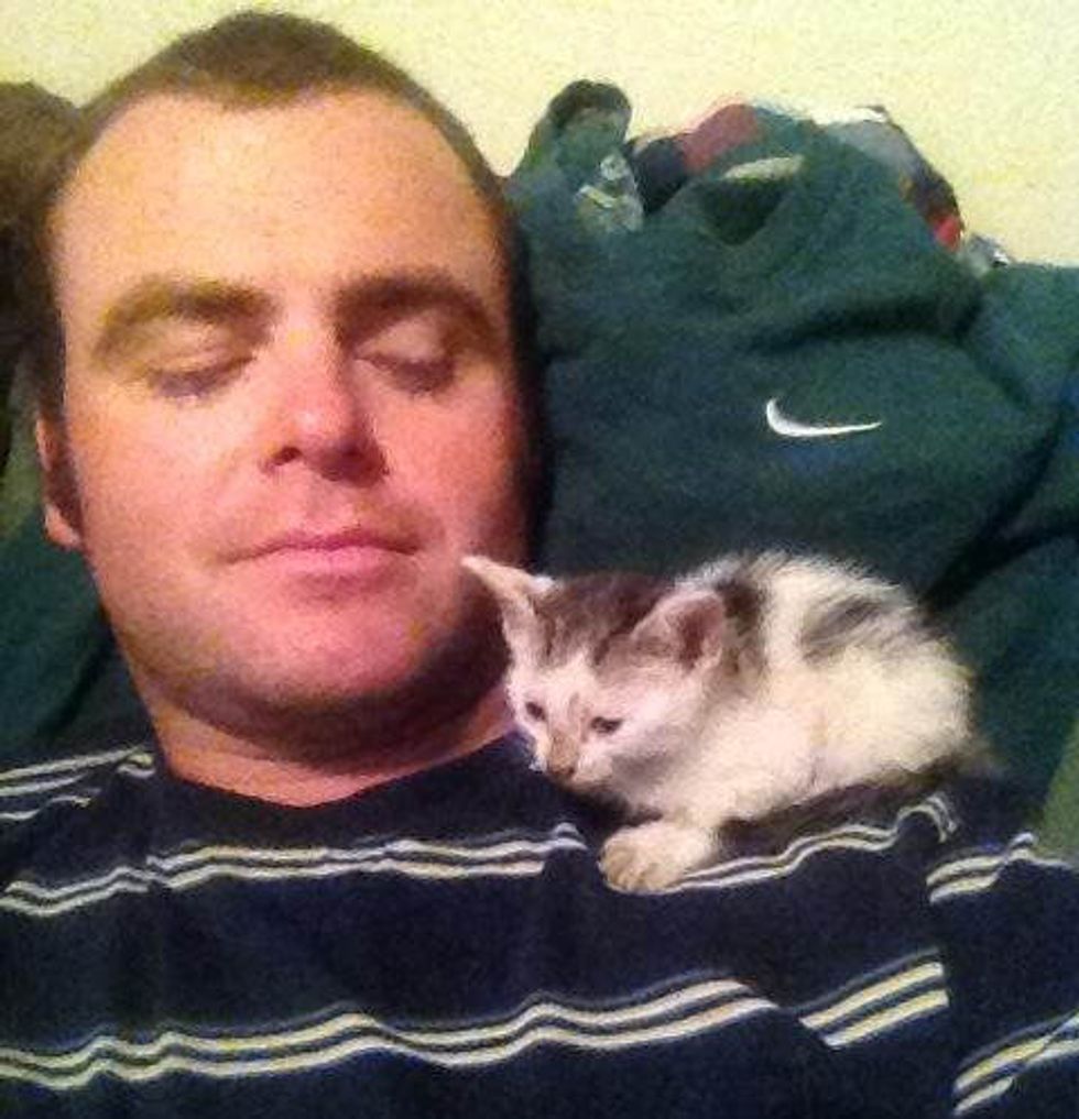 "Heading into work (one) morning and stopped at a local corner store. Before I walked in, I thought I heard a little meow....I went in for my stuff and came back out to see the darker colored one (Turner) hiding under a water/ice machine. I pulled over to where they were and scooped him up, then heard his sibling (Trixie) squeaking a little ways away. I picked that one up, called my boss to let him know I would be late and took em home to my wife and kids," he wrote. The kittens got some really needed sleep after what was probably a very rough and scary night.