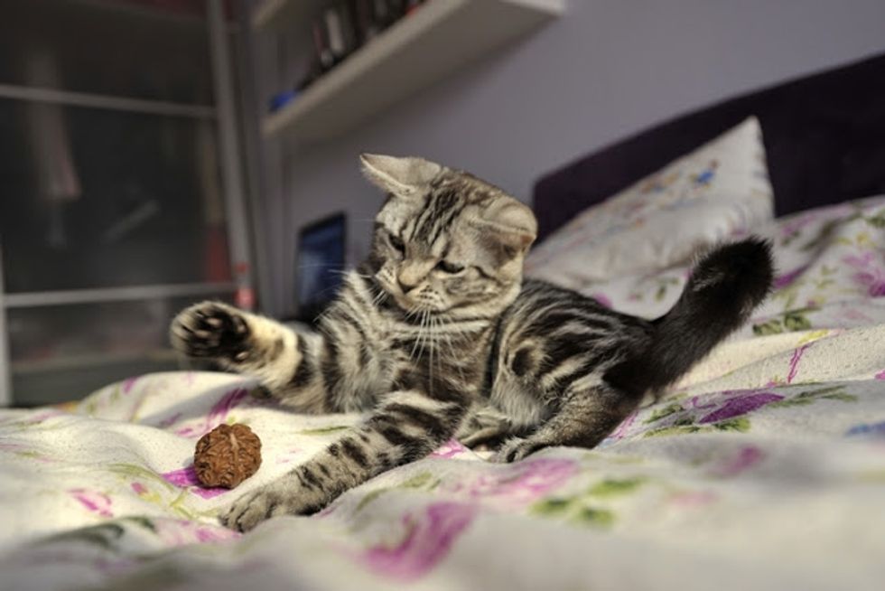 "His own little world is much more fun than anyone could imagine. Everyday he sleeps and then plays. When he gets tired, he goes to eat and sleep again. He has all the toys he loves, but his favorite toy is nothing I bought from the store. He likes to play with a walnut. If a walnut drops to the ground and starts rolling and making sounds, as it gets louder, Oscar gets more excited. Every morning before I go to work, I leave one walnut by his side, but by the time I return, the walnut is gone. I tried to look for it in every corner possible, but I couldn't find it until Oscar came over with the walnut by his paws. Before I could say anything, he just dashed off with the walnut, hitting it all over the place again."