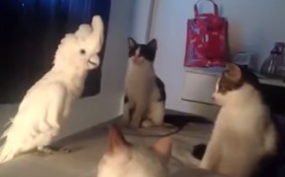 This parrot has become the boss among a gang of kitties. She even speaks meow to command her presence.