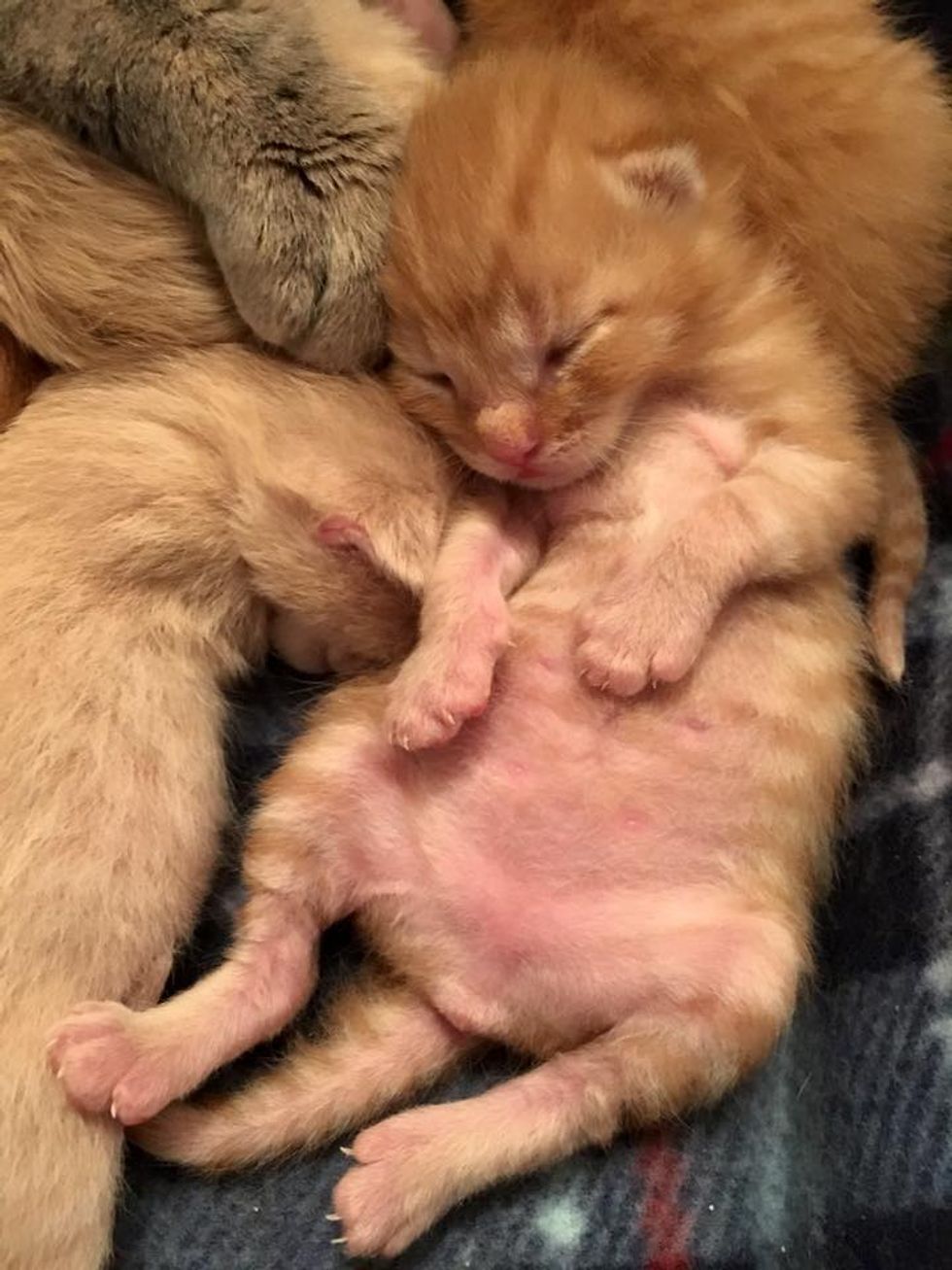 "One morning, we went to run errands. We were only gone 2 hours and came home and found Nala had had 6 kittens. They were all very tiny, especially the only girl. The little girl only weighed 2 1/2 oz. Nala had 3 buff kittens and 3 Orange kittens. We watched the babies very closely the first few days, weighing them every day. Much to everyone's relief all 6 kittens are steadily gaining weight."
