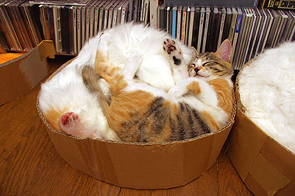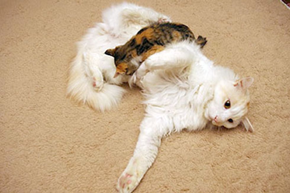 Castella melts on her kitty friend Okaki who gives her his belly.