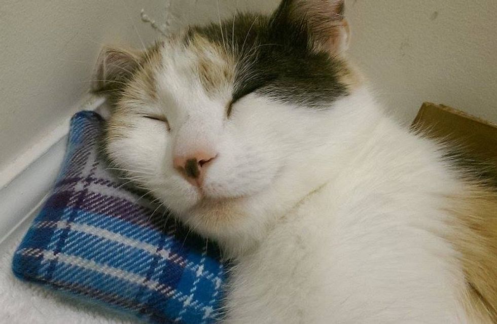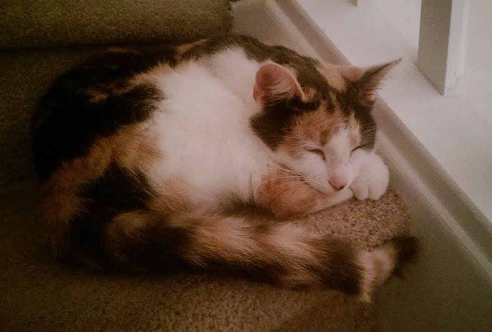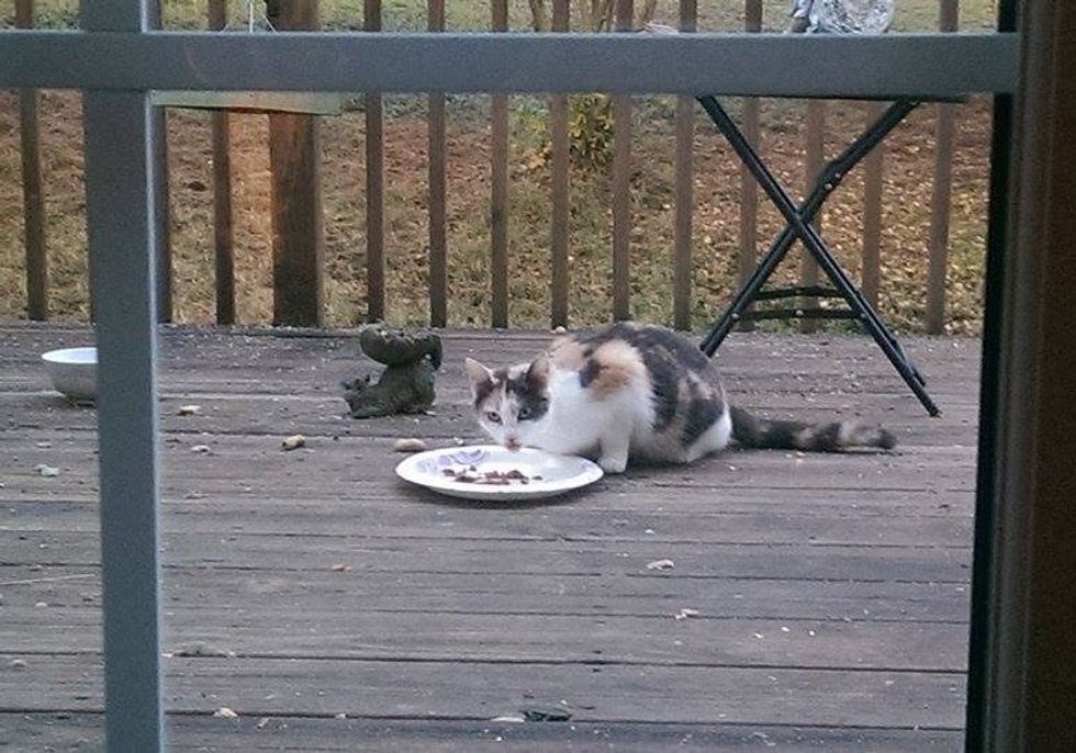 Mrs. Wigglesworth! showed up on a family's deck one day and decided to hang out for a bit. The family put cat food outside, hoping she would take it. She did and finished it all.