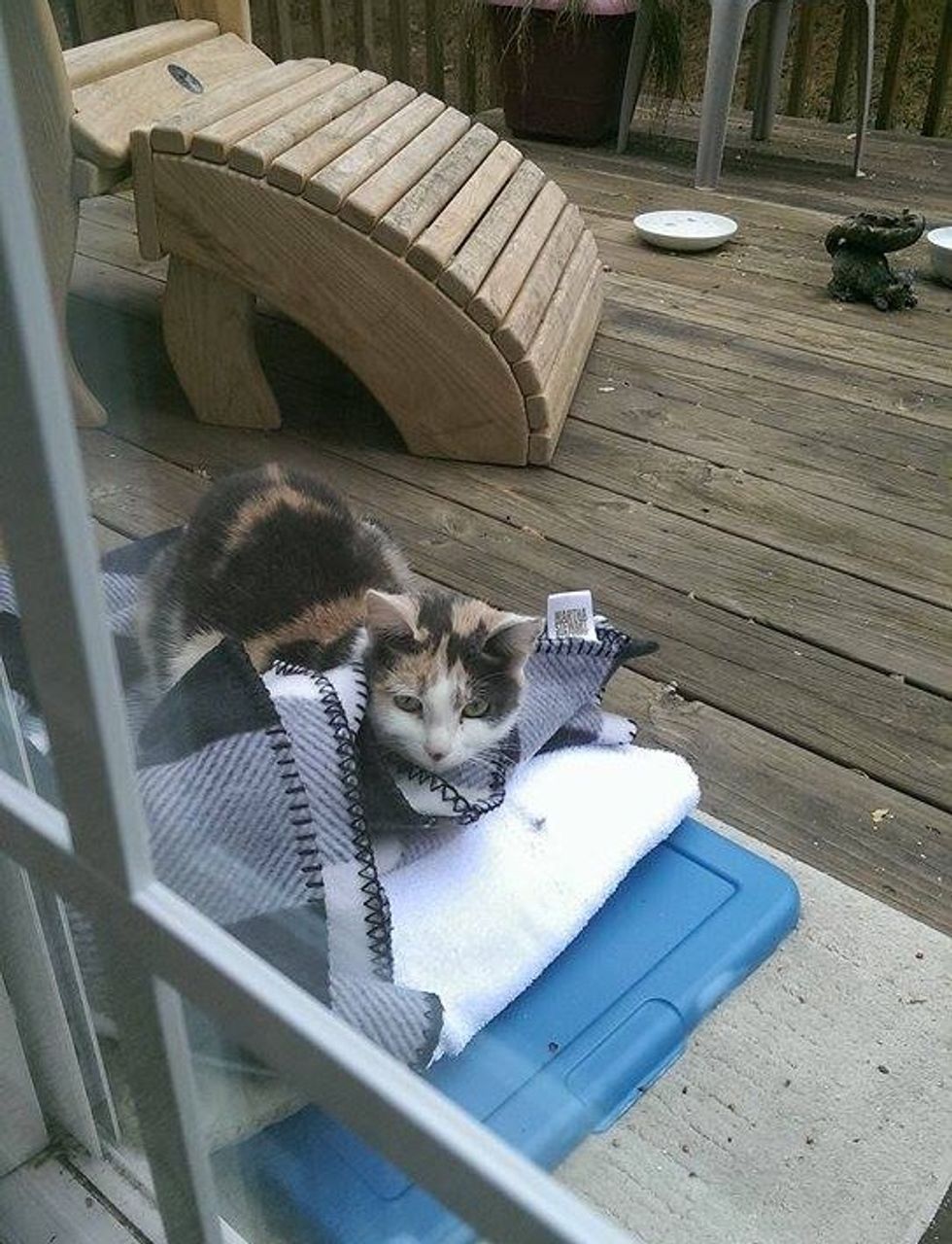 The family continued to try to befriend the stray cat by setting up a warm bed with blankets so she could feel comfortable staying on the deck. The kitty loved it and just kept coming back.
