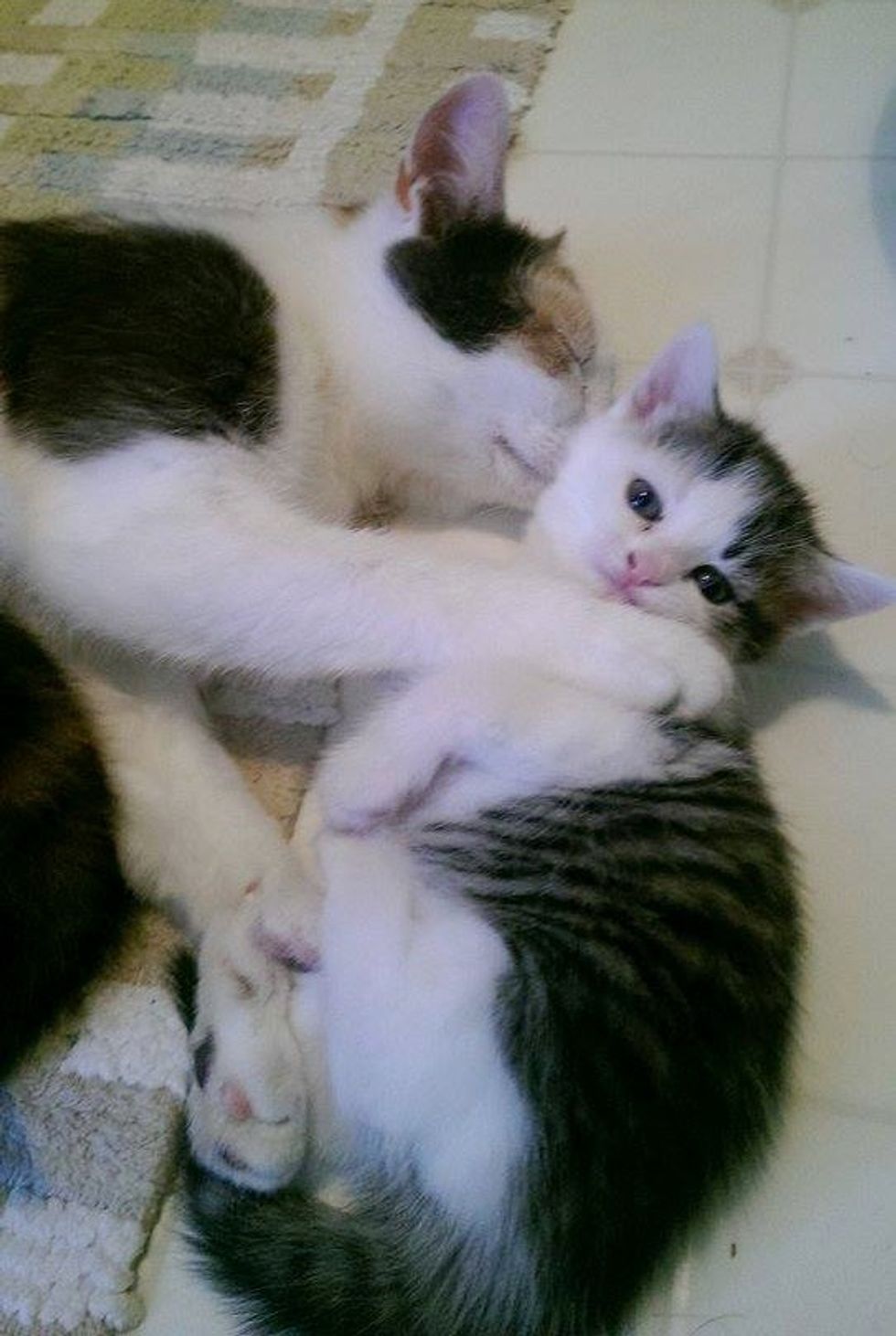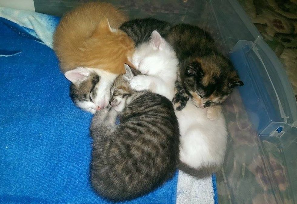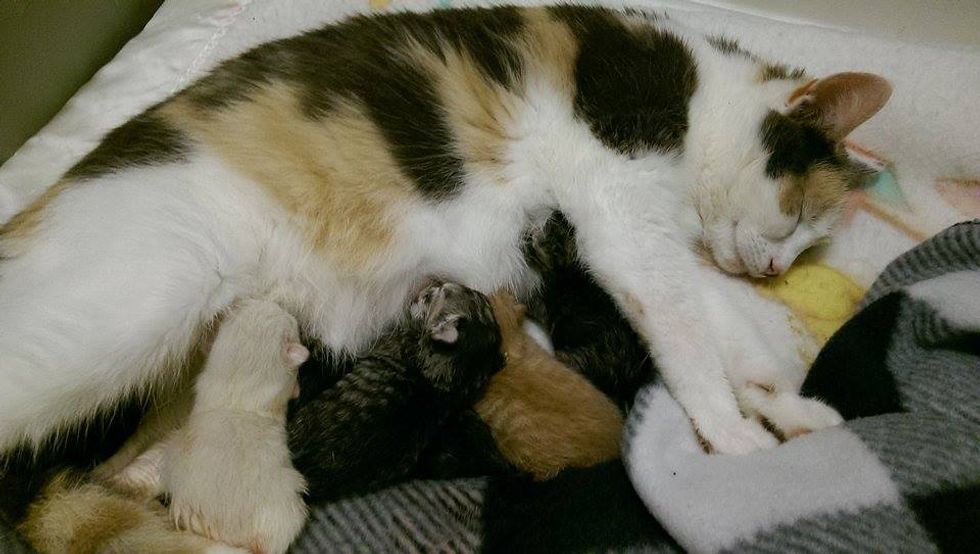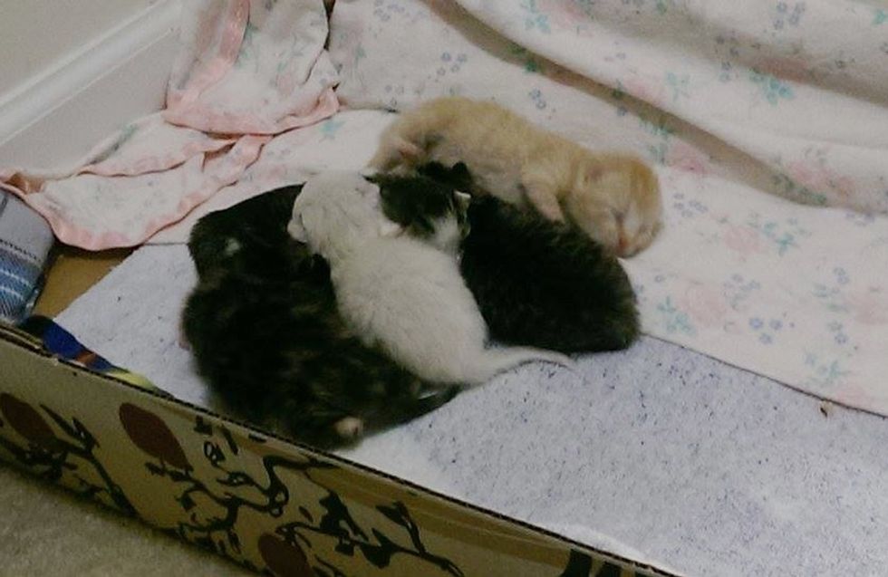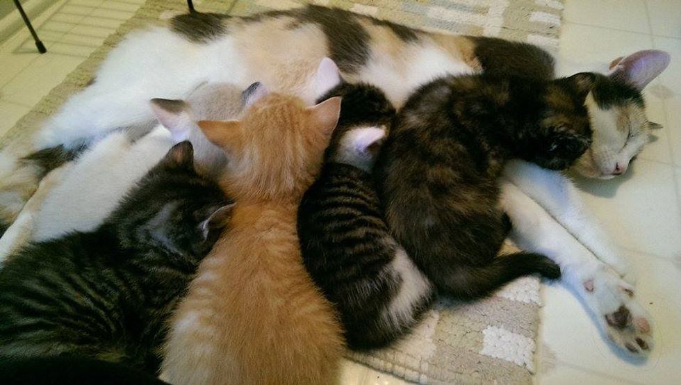 "She had five kittens - One calico, one that's orange, one that's pure white, and two that maybe are calicos.