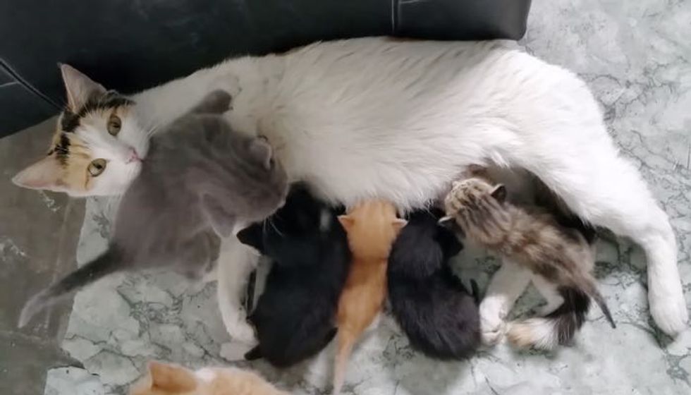 A stray cat who lives near a shop had given the shop owner quite a surprise. She obviously had given birth and was nursing her kittens., but three of the kittens are much smaller than the others. It seems that they are from two different litters.