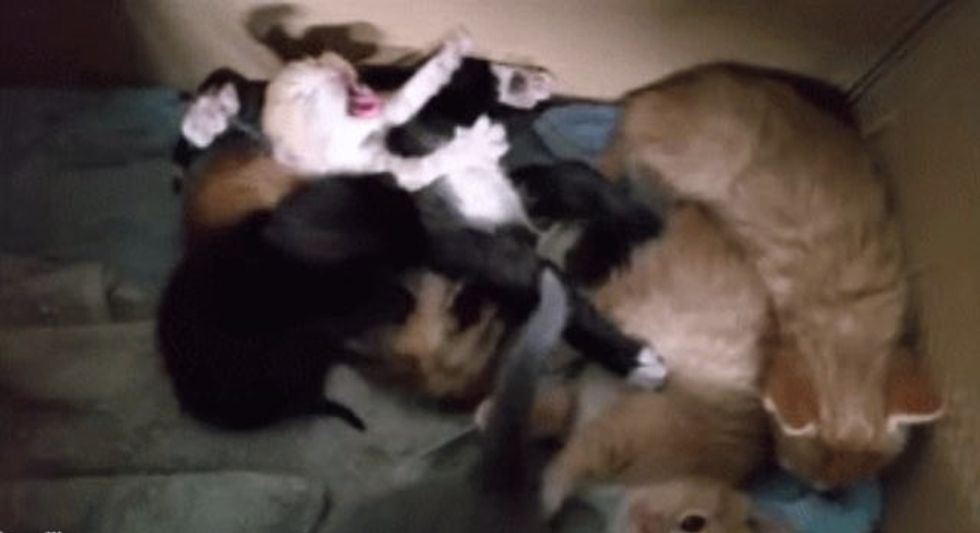 They don't know how mama ended up with three kittens that are half of the size of their bigger siblings, but one thing they know for sure - mama gives them all the equal amount of love.