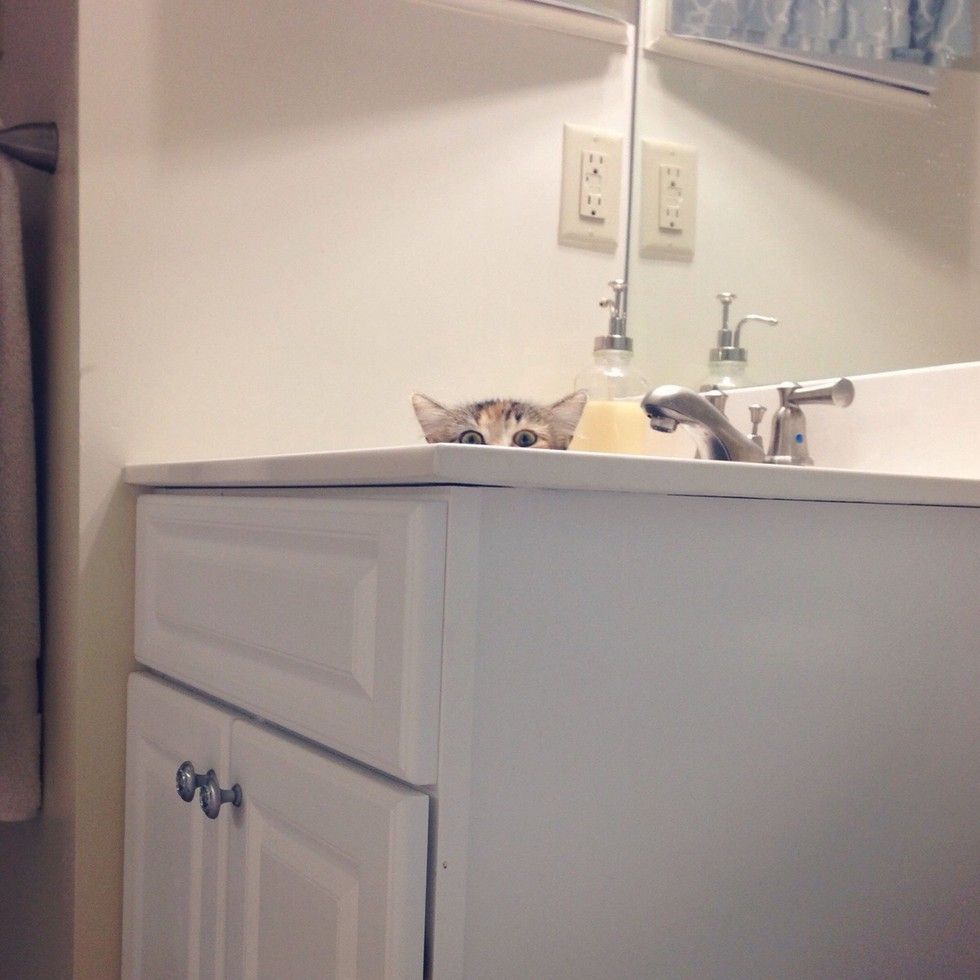 Meeka is curious about everything her human does in the bathroom.