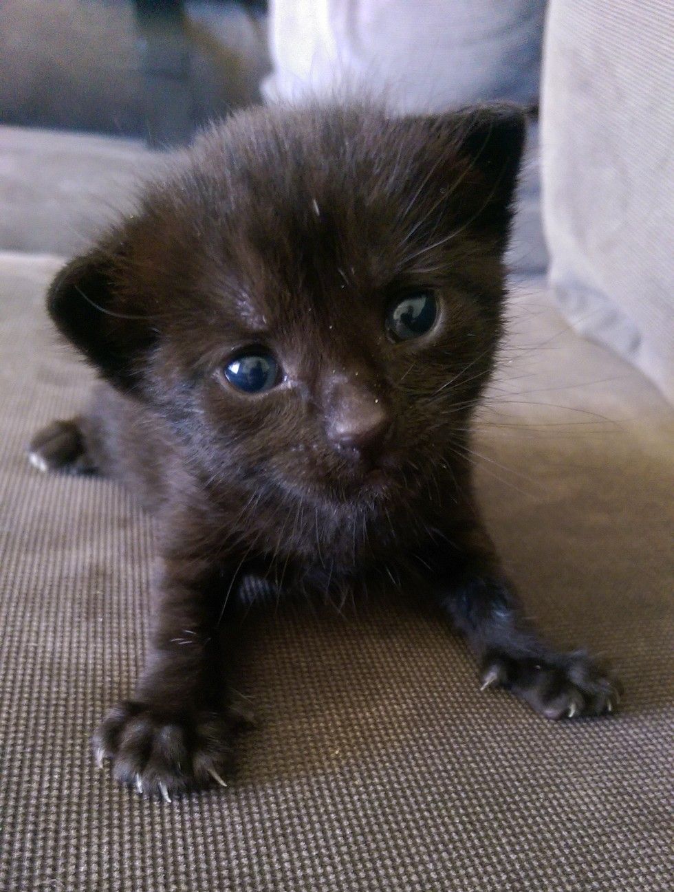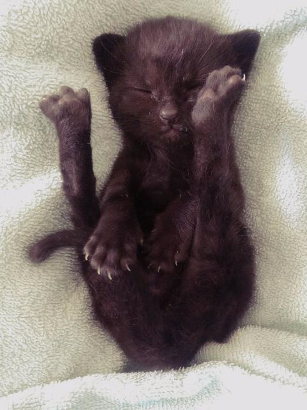 A little orphaned kitten was found behind a shed one night, squeaking for help. "She was abandoned by her mother," reddit user shmiksi said.