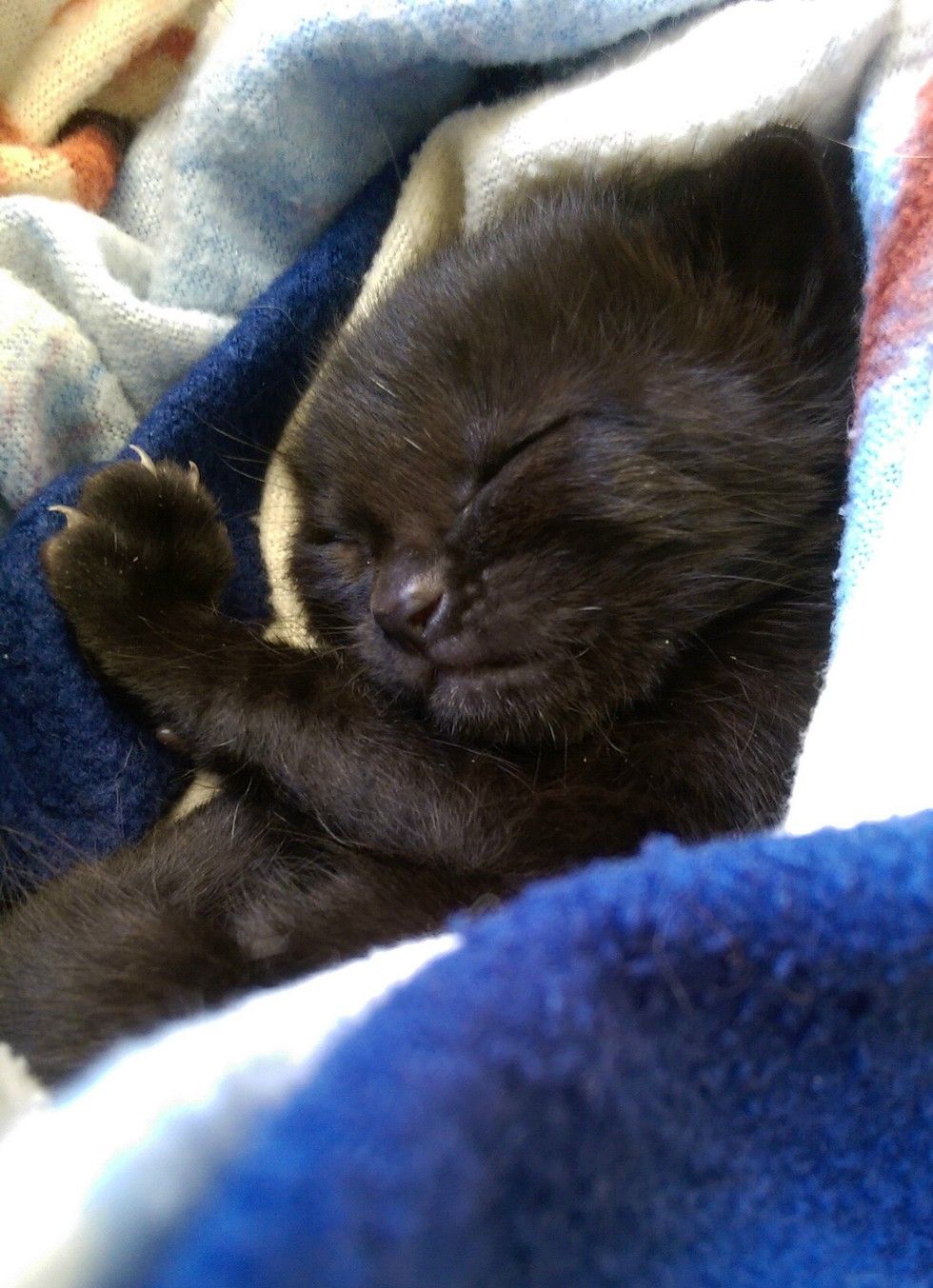 "She's been cleaned, fed and is now sleeping next to me with her tiny head resting on my thigh...