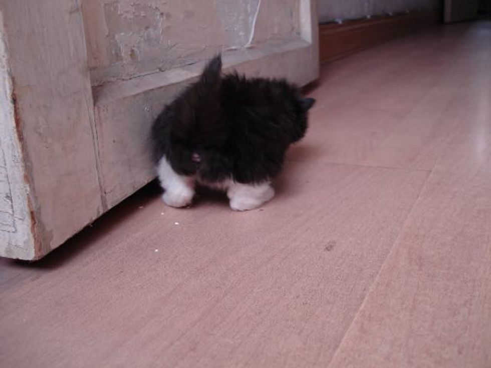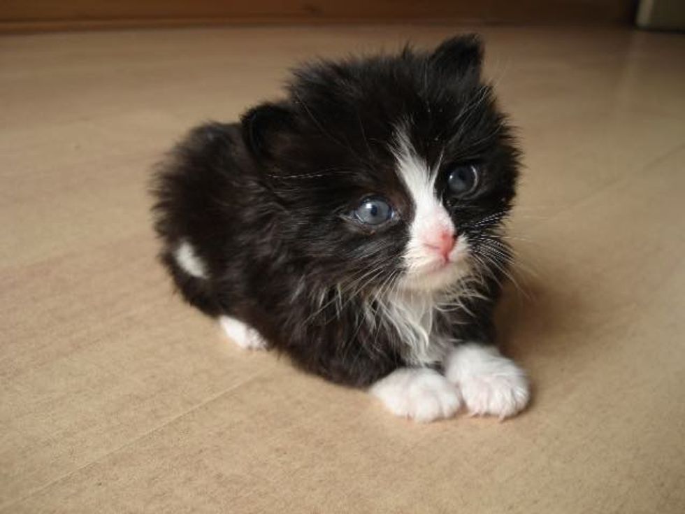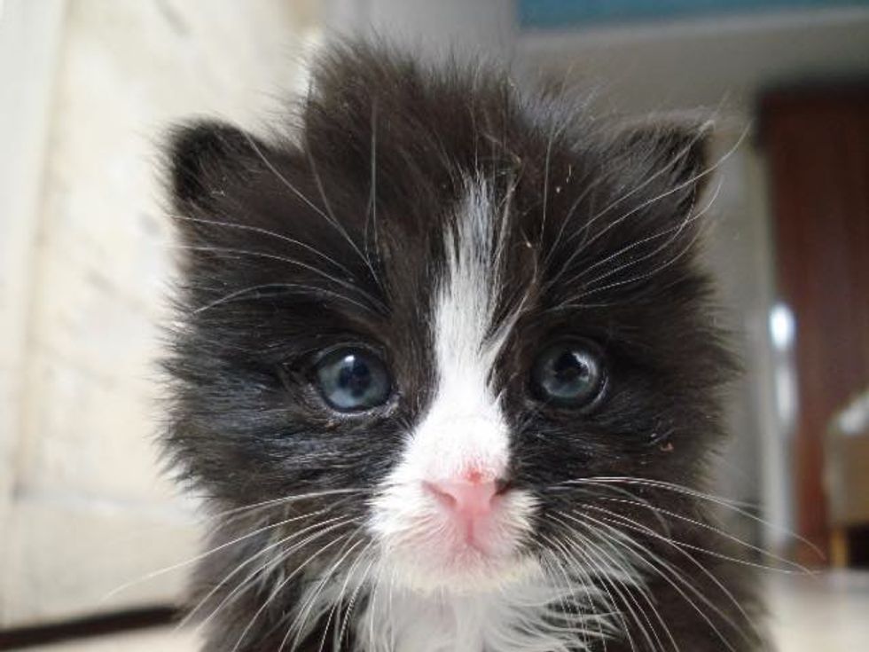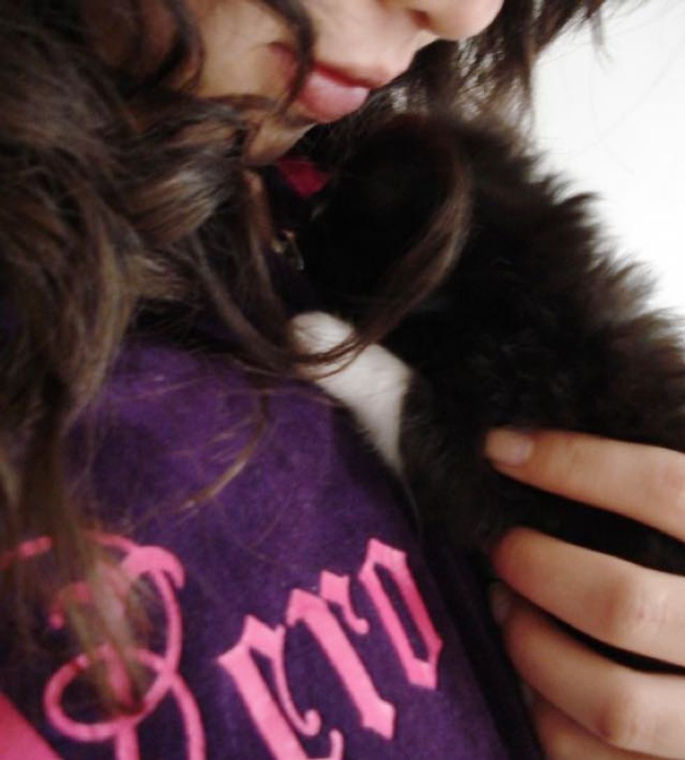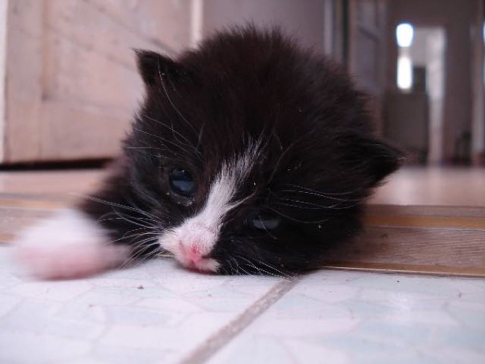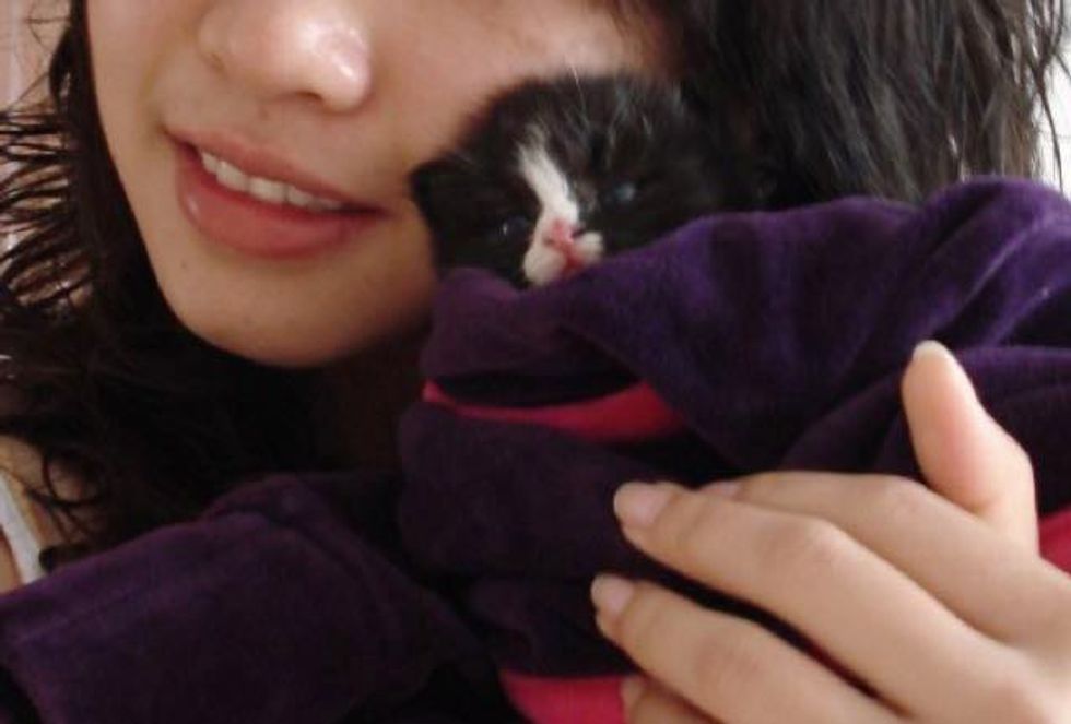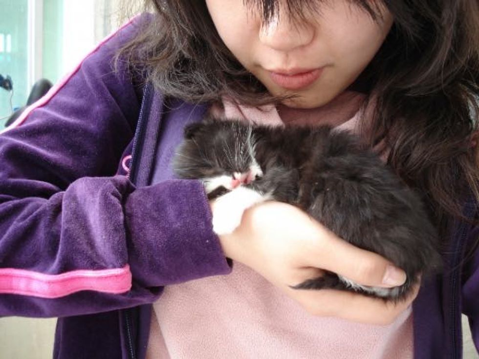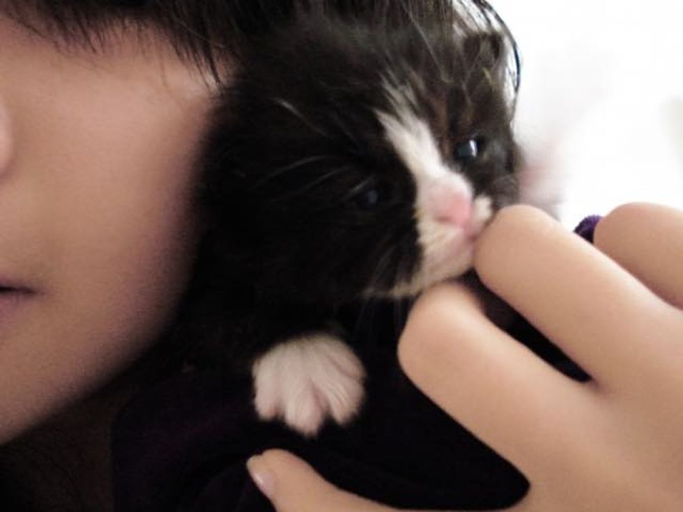 Mo rescued this tiny ball of fur who was so young that she could barely meow. The little tuxedo girl was in need of a bath and a lot of love. When Mo took her home, the kitten clung to her like a baby to their mom.