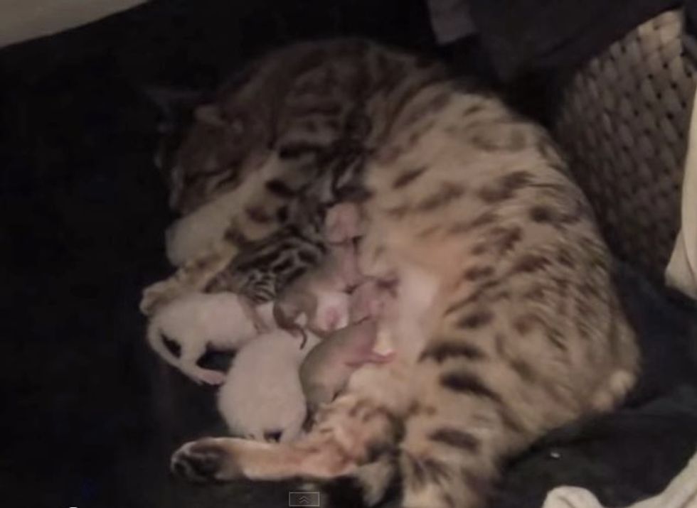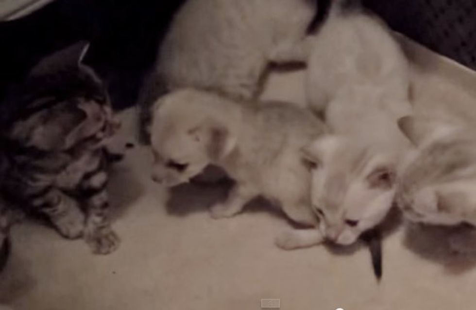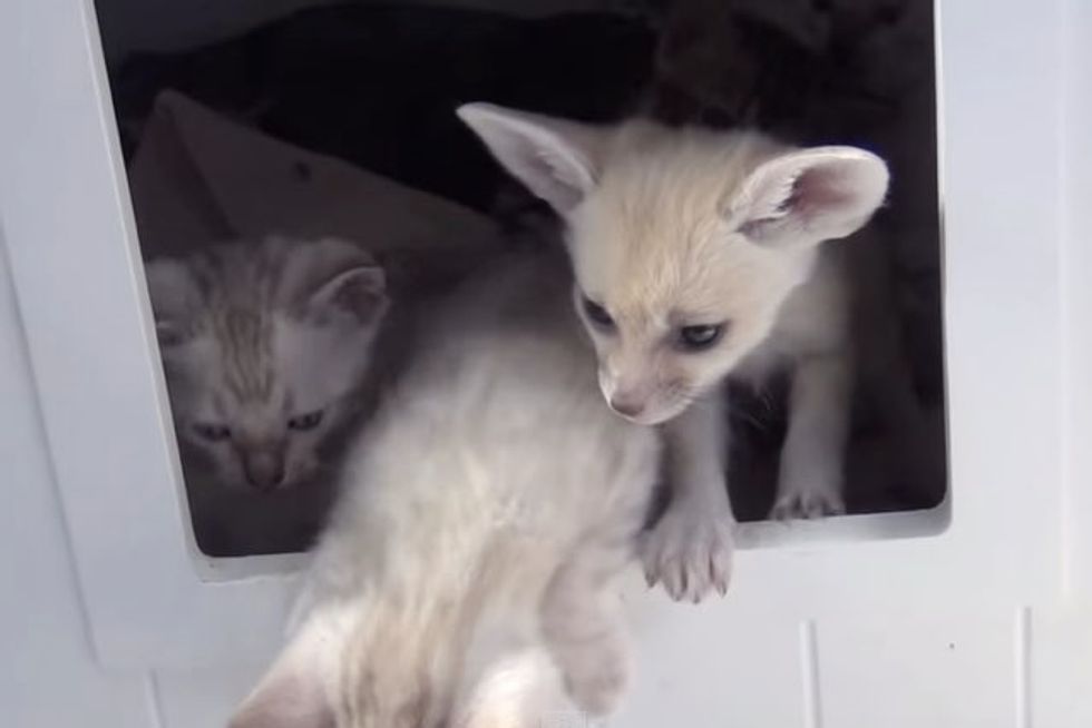 Little Fennec fox babies are nursing along with their feline brothers and sisters.