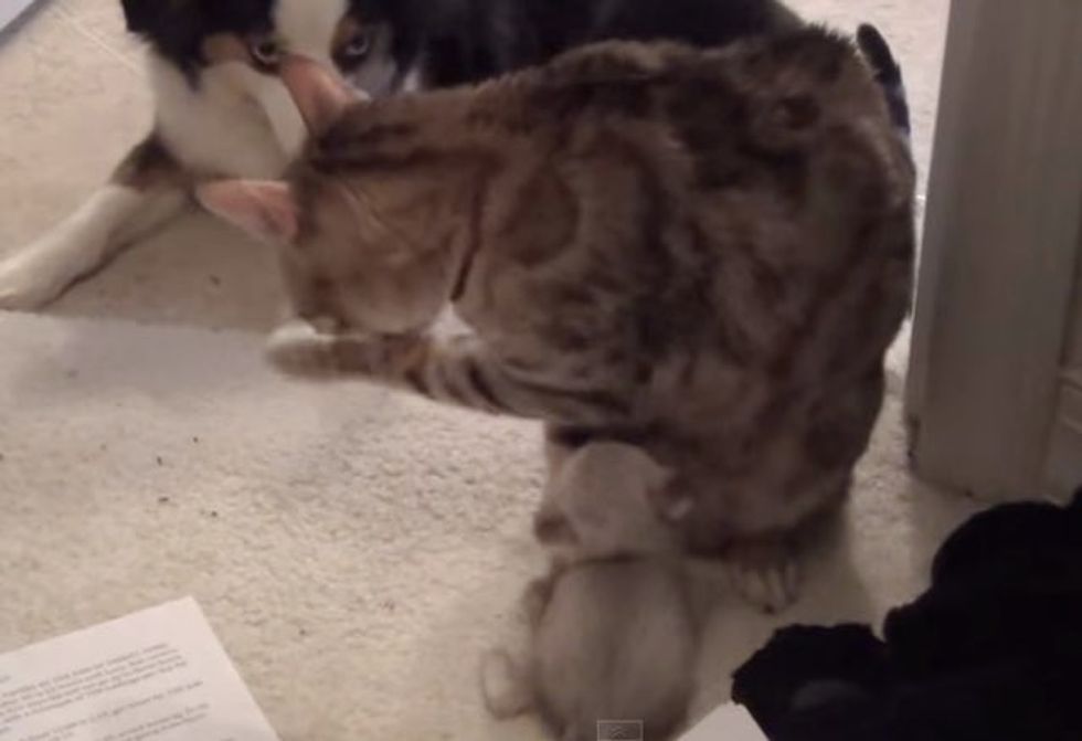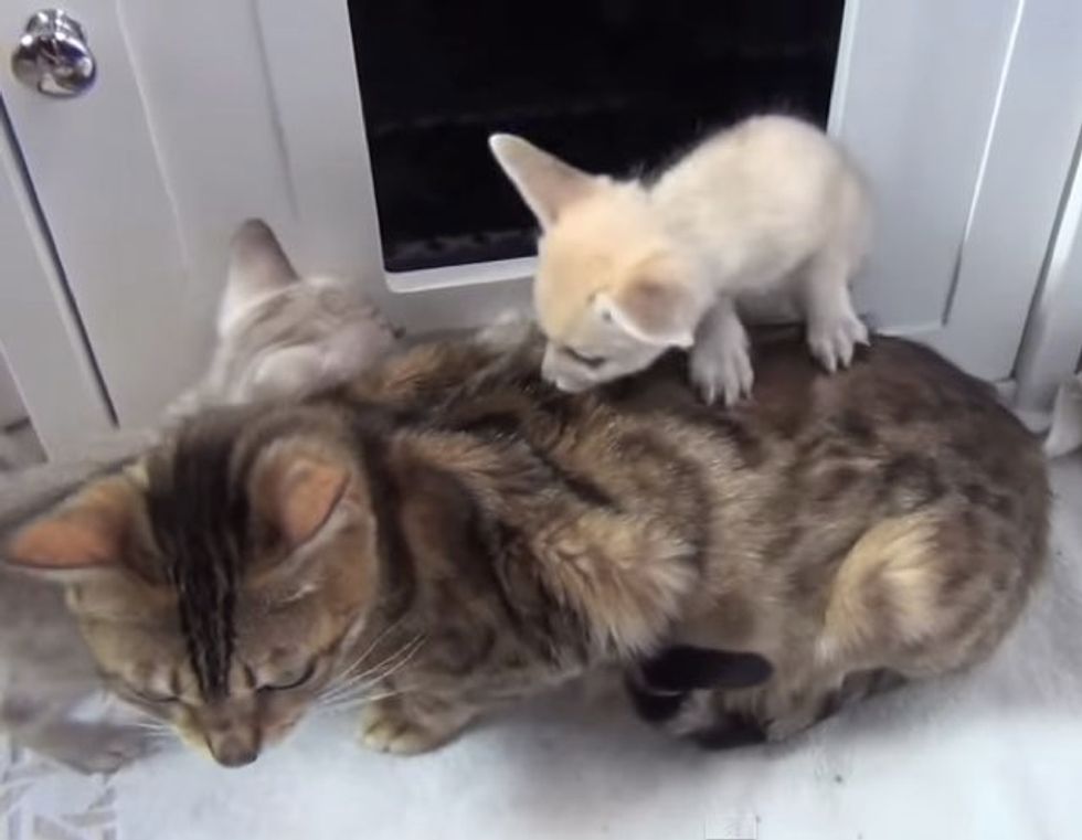 Cat mama adopted two tiny Fennec Fox kids into her big furry family. This is them growing up with their kitten 'siblings'.