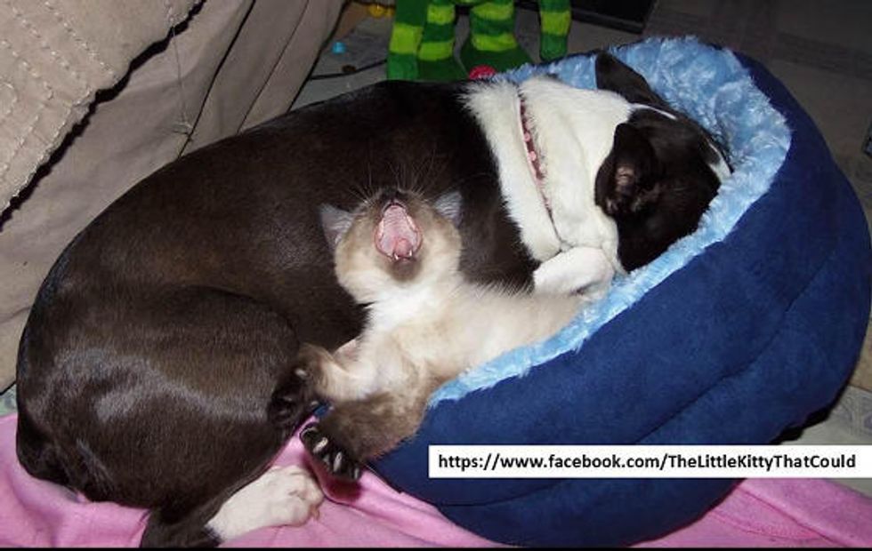 Pretzel loves her doggie friends and always plays with them and takes naps with them. A bath is sometimes necessary as a result.