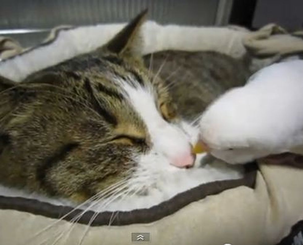 U-chan the albino bird loves to bother his kitty friend Chama when he is trying to nap. Chama met U-chan when he was a little kitten rescued by the family. They grew up together and are bonded buddies :).
