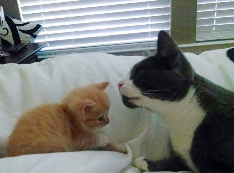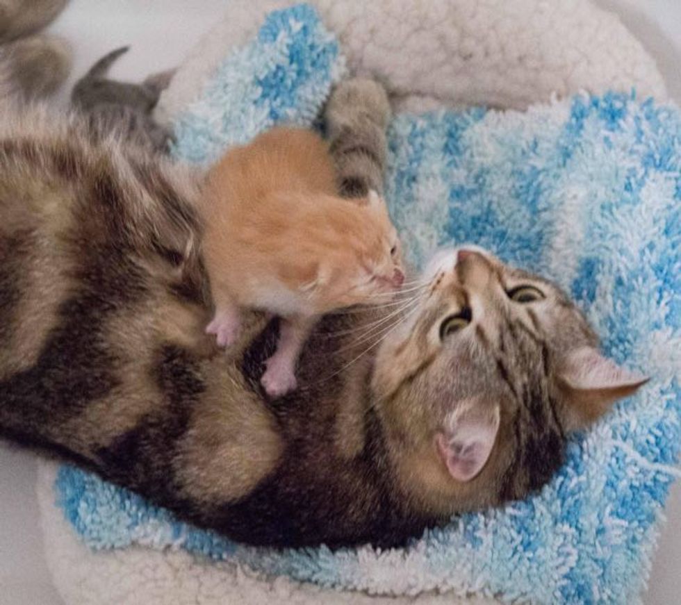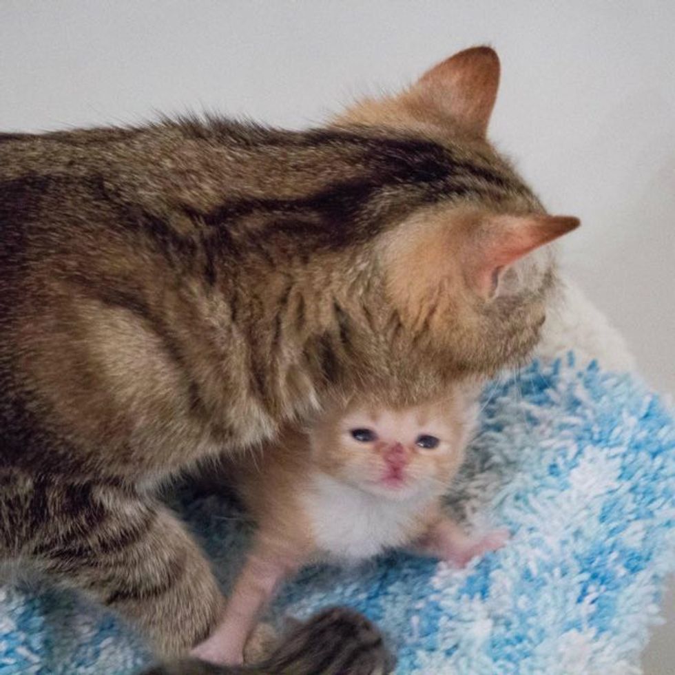 They found Pekoe a surrogate mom who immediately laid down and started nursing him like a mother would. "Our kitten looks SO content that he has a surrogate momma kitty."