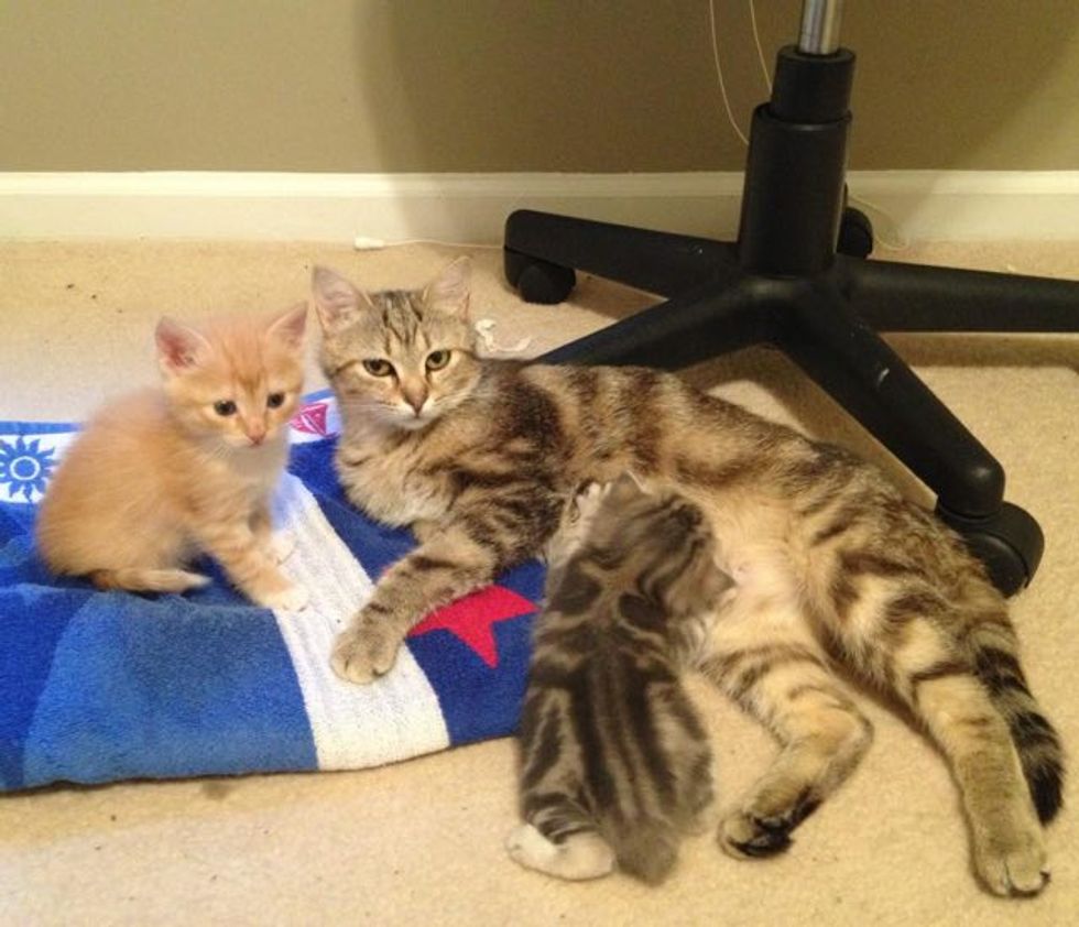 "It was tough bottle feeding Pekoe and fortunately, we found a mother who had just had a litter of kittens for him to nurse with. He's been WAY happier," he added. "She's a really sweet momma kitty. As soon as we got her home, she flopped down for the babies to eat. It was pretty darn cute." (reddit)