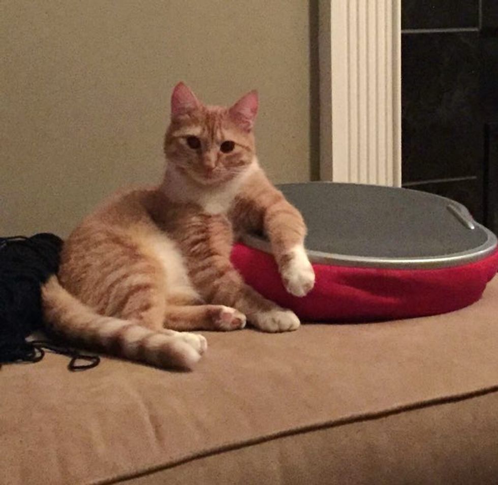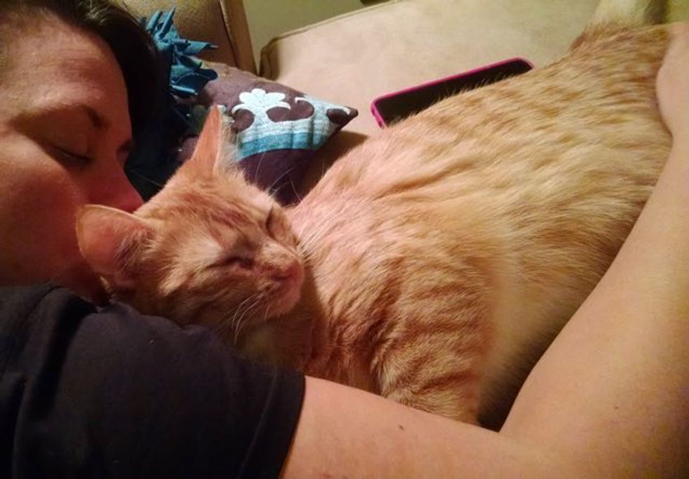 "Pekoe loves sitting in our laps and he purrs CONSTANTLY." After fostering the little ginger kitty for a period of time, they simply couldn't part with him.