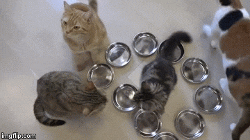 I can't even get two of my cats to eat at the same time, these 10 cats munch away together in purrfect harmony, even in different dish formations.
