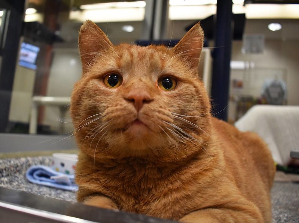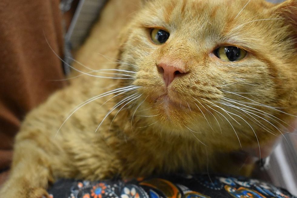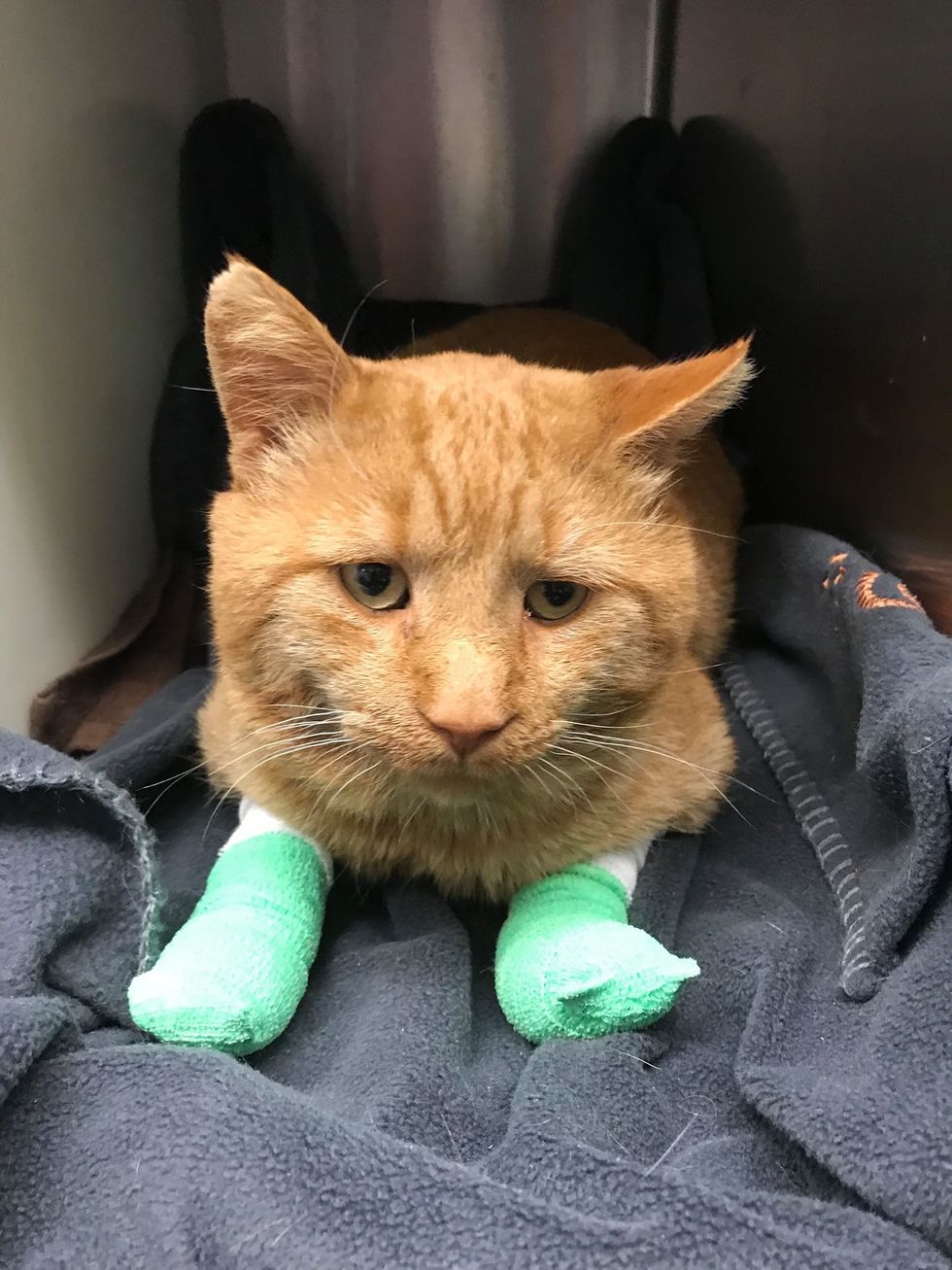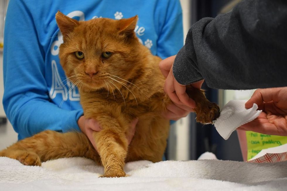 A 10-year-old ginger cat showed up on a porch in Ontario, New York. A family saw the feline hanging out with his paws all tucked in. Upon close inspection, they could tell that the kitty needed help.