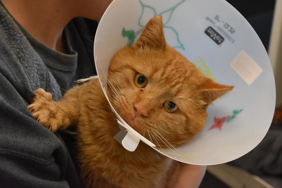 "At this point in his healing process, Buster no longer had to wear his mittens constantly. He was wearing a cone, so that he didn't lick or bite his paws.