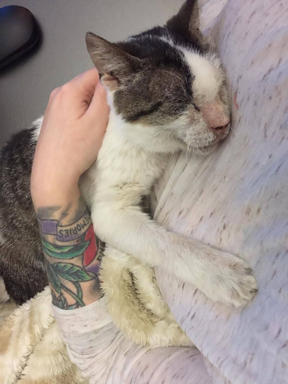 They welcomed the sweet kitty into their cat sanctuary where he will spend his golden years in peace and comfort. The kitty is missing some hair, has a few rotten teeth and needs some help cleaning his fur coat, but he is absolutely in love with his new family.