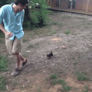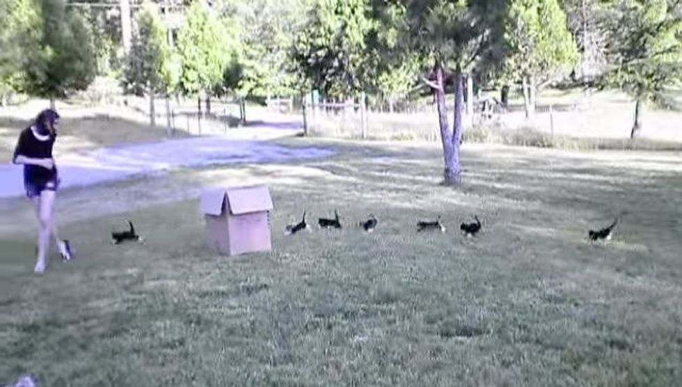 These 13 tiny kittens (born to two rescue cats) are out for some exercise in the yard. They start chasing after their human, forming the most adorable train!