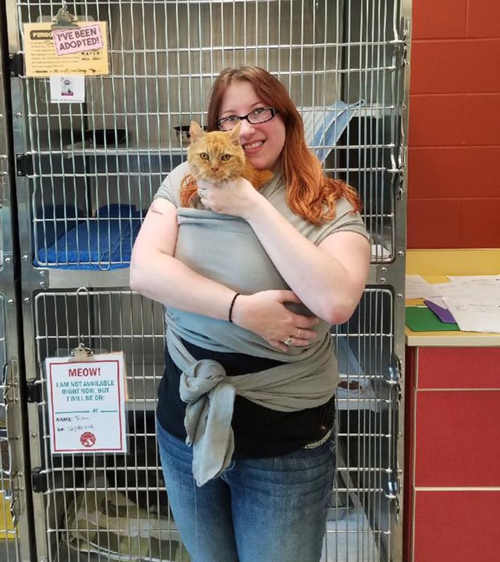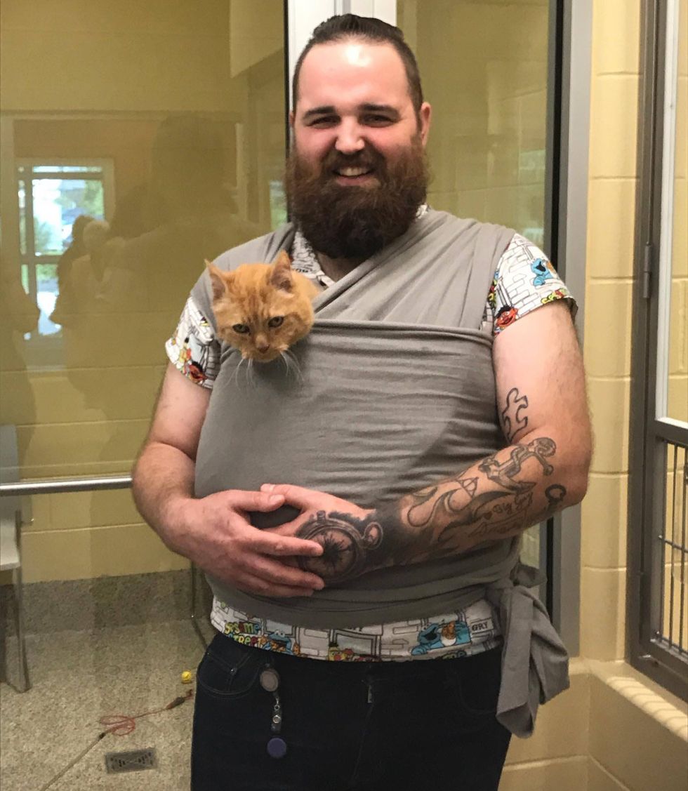 "The baby carrier gave us the ability to keep Dougie satisfied with constant affection and give Robert some freedom to help visitors and adopters," Roth told Love Meow.