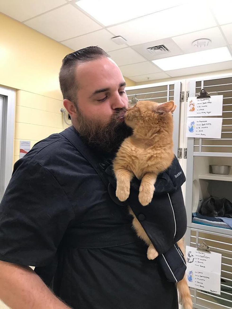 Shelter staff were happy to oblige to his demands, but they needed to figure out a way to get things done while carrying a purring kitty.