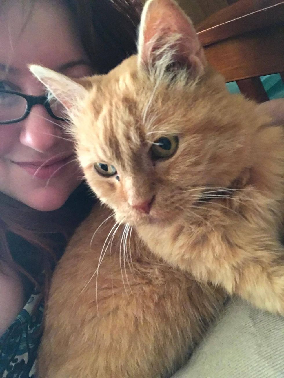 A 15-year-old ginger cat loves nothing more than to be held, all the time! He will meow and meow until you pick him up and hold him snugly in your arms.