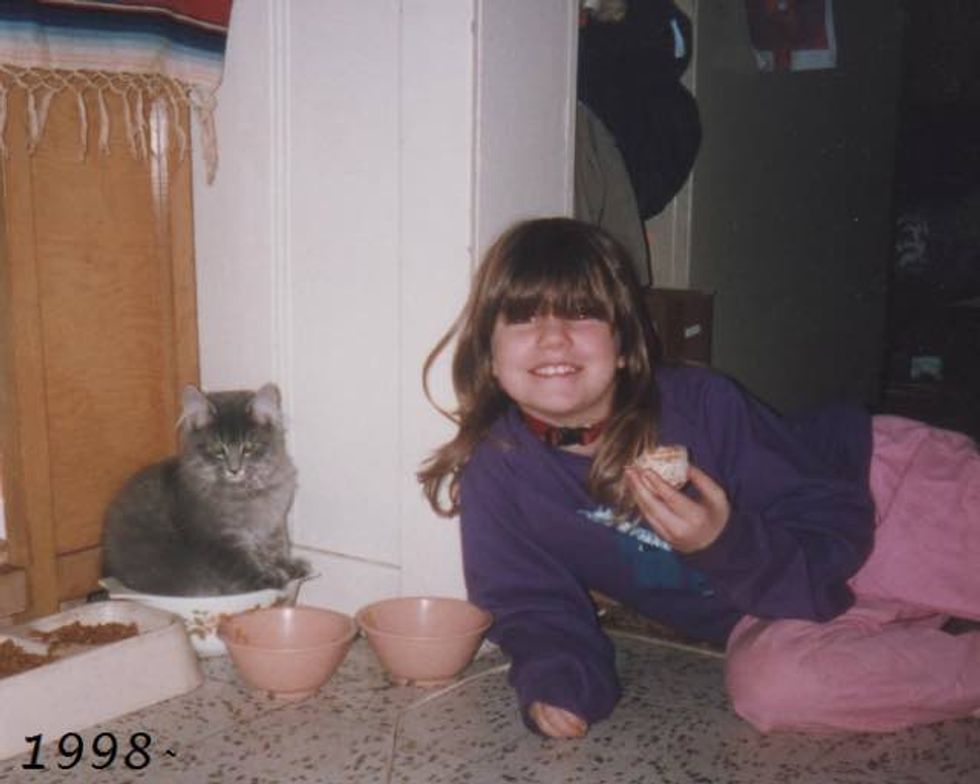 Two days (after my eighth birthday), I heard very loud meows coming from the bush behind our property. I searched and found a beautiful cat giving birth. My mother and I took her into our home and made a bed for her in my dresser drawer. Upon finding the cat's owner, we were informed that the mother cat was unlikely to survive birth due to a heart condition, yet she had survived. The owner was so thankful that she allowed me to pick a kitten to keep as my own.