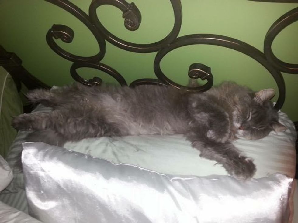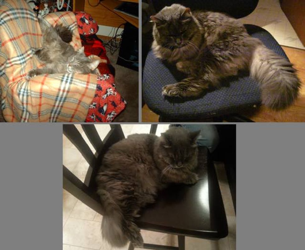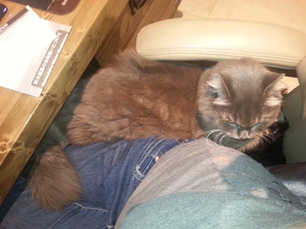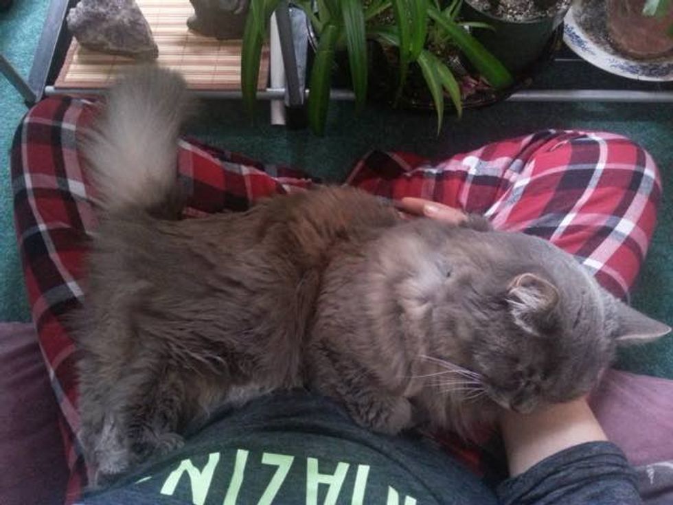 Spooks kept me warm while I gamed out. He would fit wherever he could, squishing behind my back or wrapping himself around my waist.