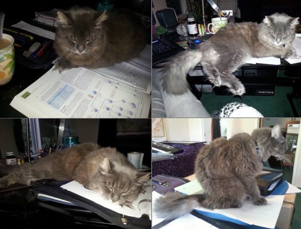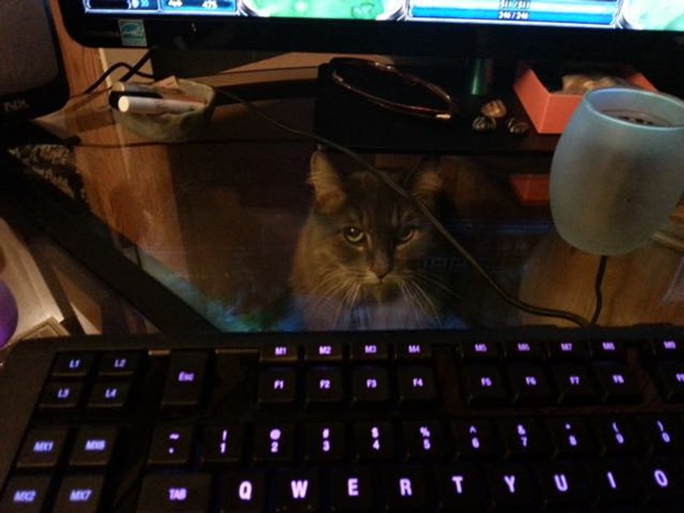 And the time I bought a glass desk. Spooks realized he could now sit on my foot stool and stare at me all day while I played games, and so he did.