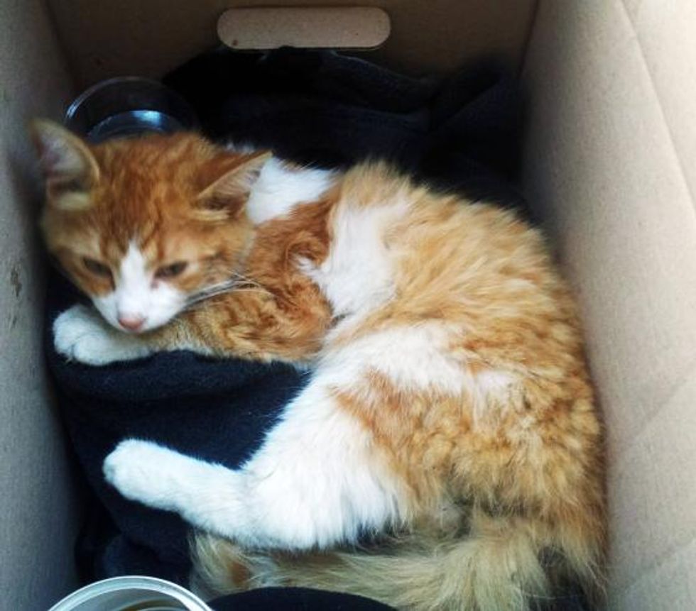 "[She] was terrified and felt safe there I suppose. Has a wound on her leg as well. Wandered in off the street." said Cone via reddit. "We left food and water near her, she ate some over night when all was quiet. We also slid a sweater under the pallet so she would get accustomed to the smell and gravitate to that person when we got her out. That little kitten melted about 30 hearts this week. A dozen people stayed late on a Friday to get her out."