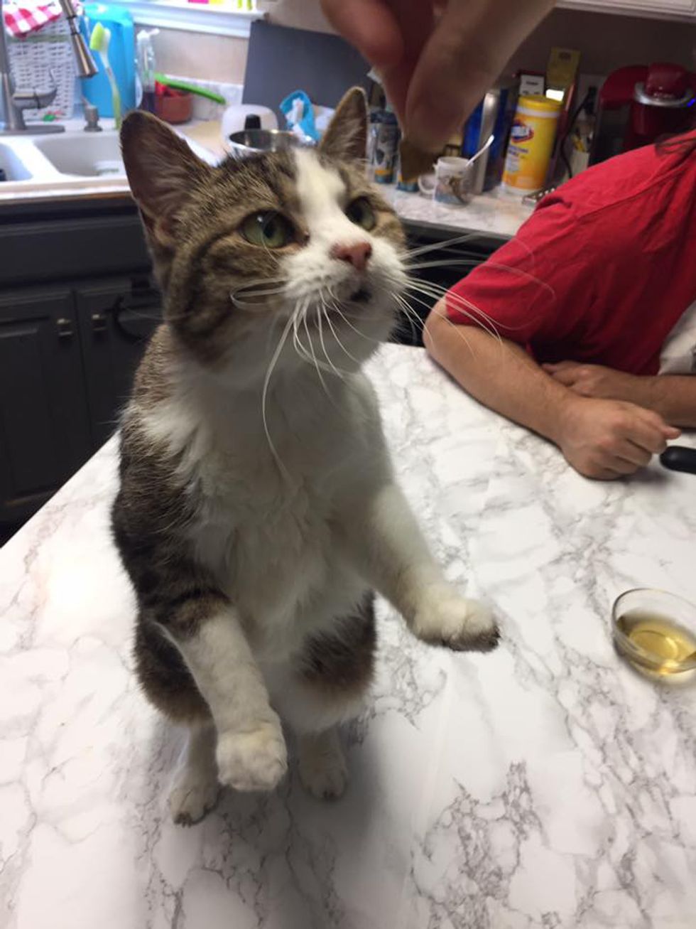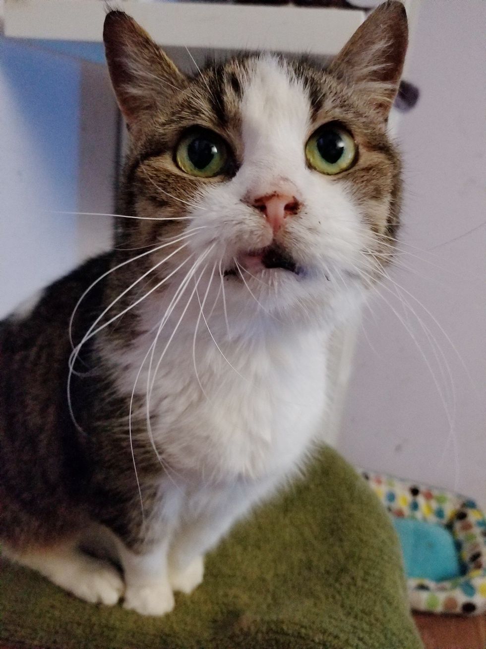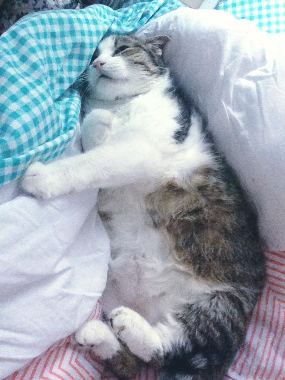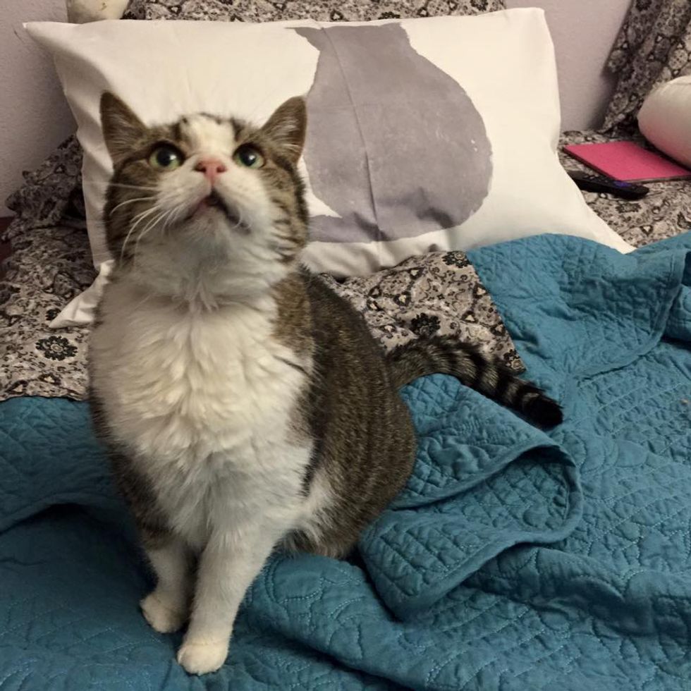 She's 20 years old, missing a few teeth, and has bad memory, but this kitty loves life to the fullest and never tires to tell her humans how happy she is every single day!