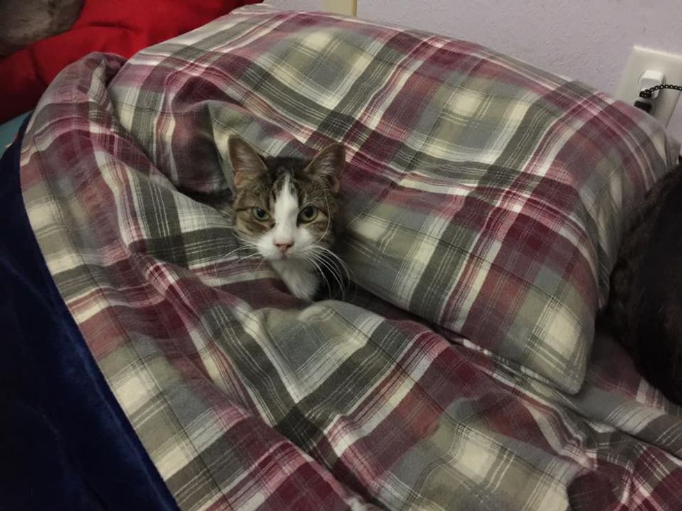 "Britches is super excited that it's finally getting chilly 'round here. She loves flannel sheets!"