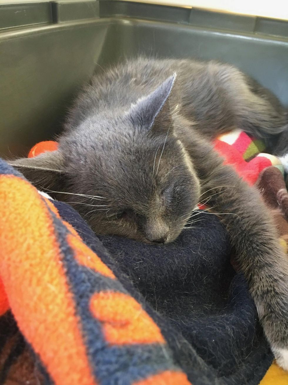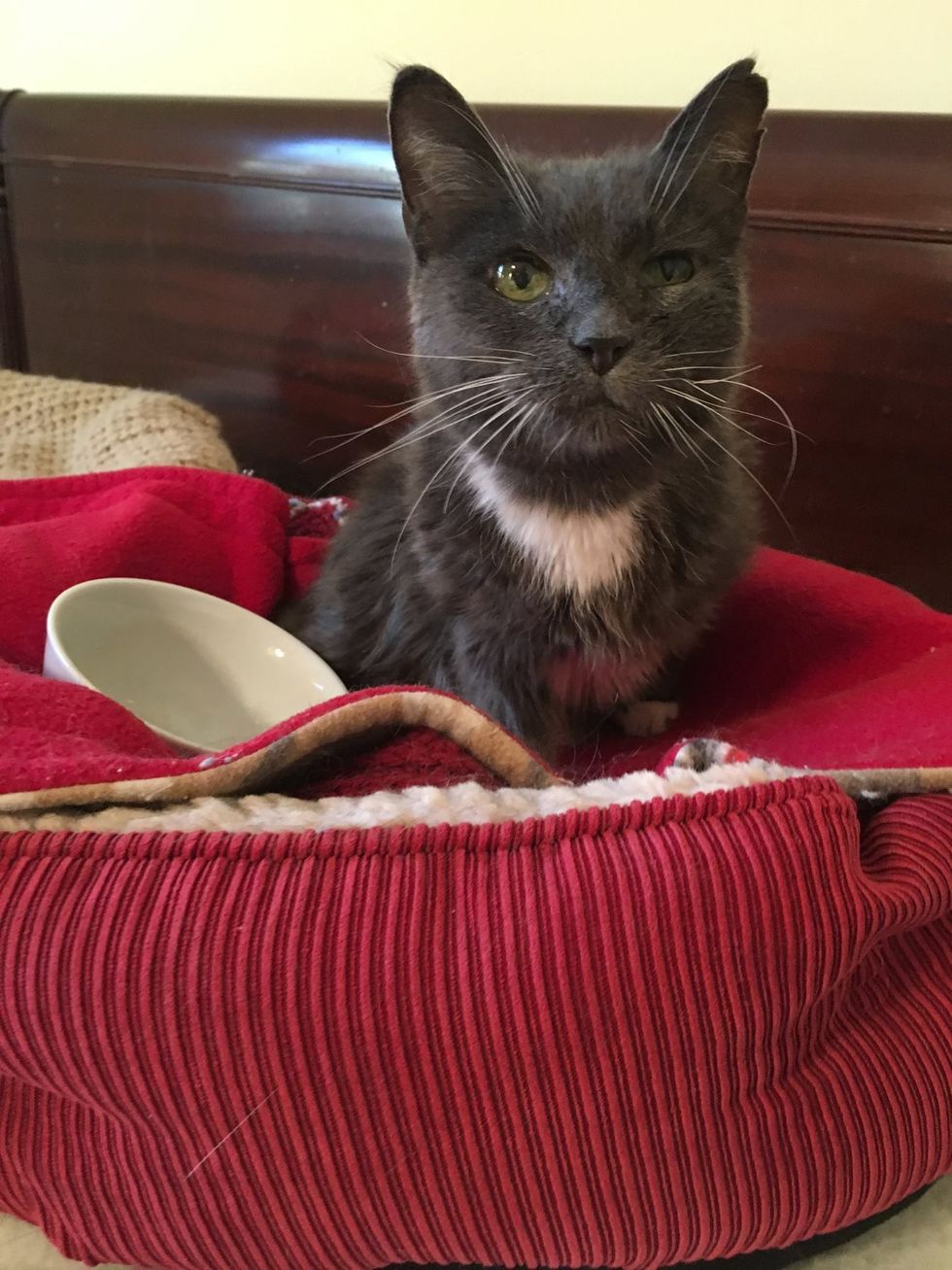 "After a busy afternoon complete with a freedom ride and a visit to the vet, this sweet kitty is settling into her heated bed, getting lots of love and thoroughly enjoying a special treat of baby food."