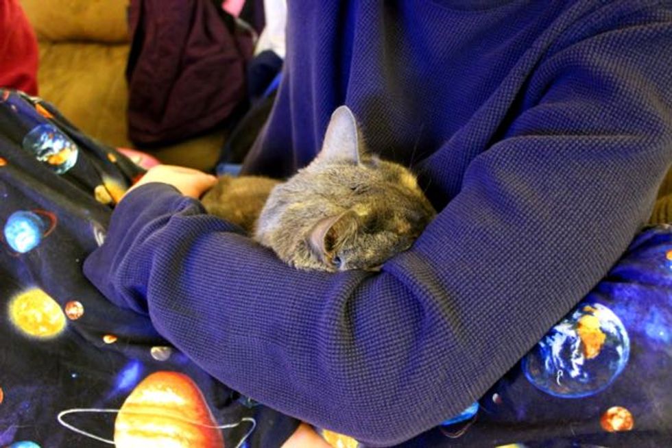 Refurb adores her human dad and sometimes will stay in his lap for as long as it takes. "Legs have long since fallen asleep. Can’t reach food in kitchen. Dehydration setting in..."