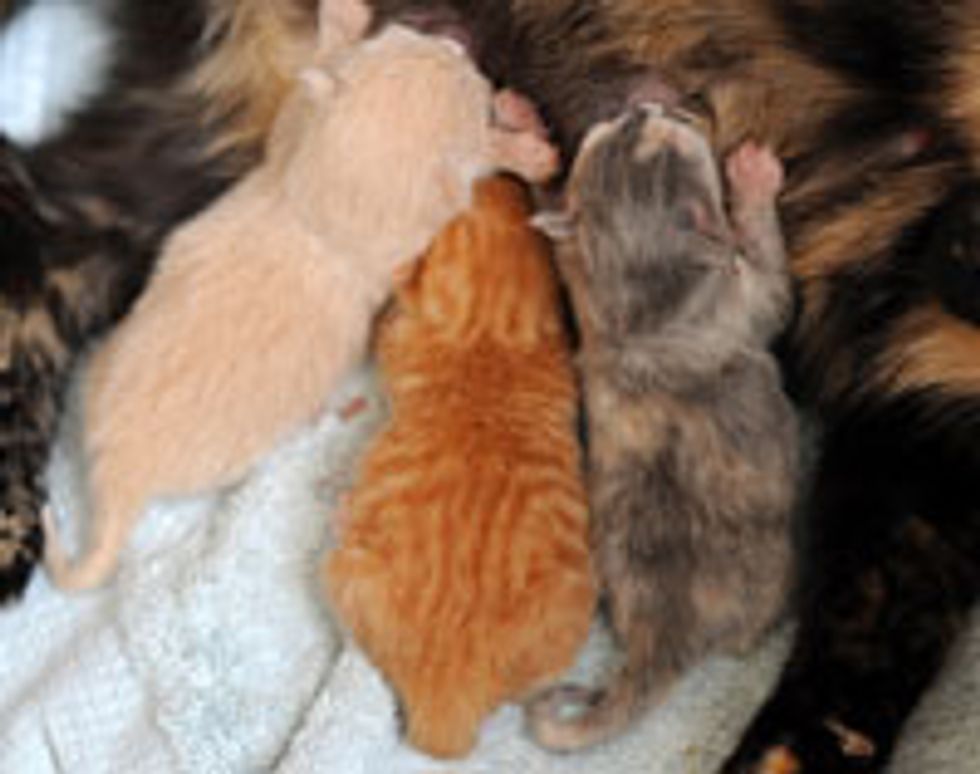 Norma finally gave birth on Sunday afternoon. "She never cried out and purr the whole time except when she was pushing! I was so proud of her. The first one is a sweet little dilute tortie. She took to her right away. The second kitten came pretty quickly after the first, I wasn't prepared for it! About a half hour later the third one was born... The third one is a little cream cutie! After the last one was born she totally relaxed and finally laid down with the babies. I took this as the time to scoop up the kittens and put them in the box. Mom followed then and they cuddled in for the night."