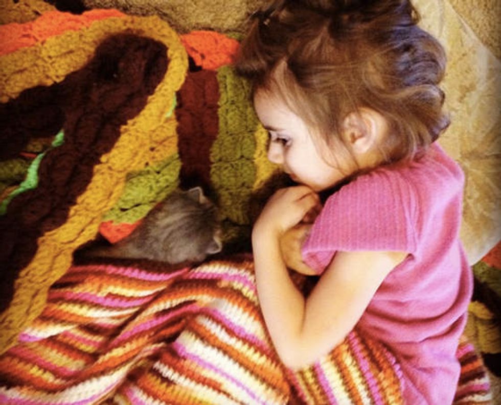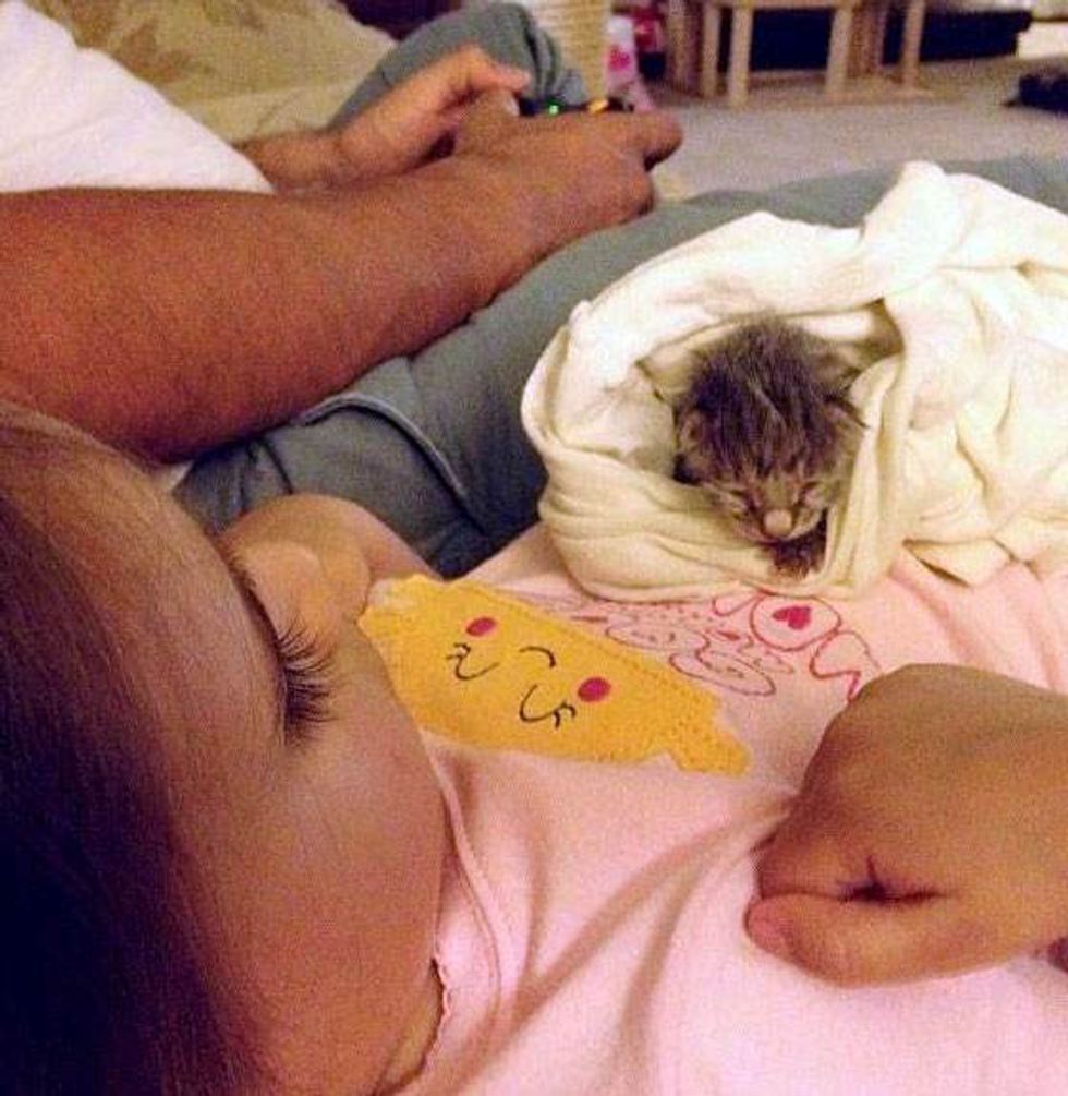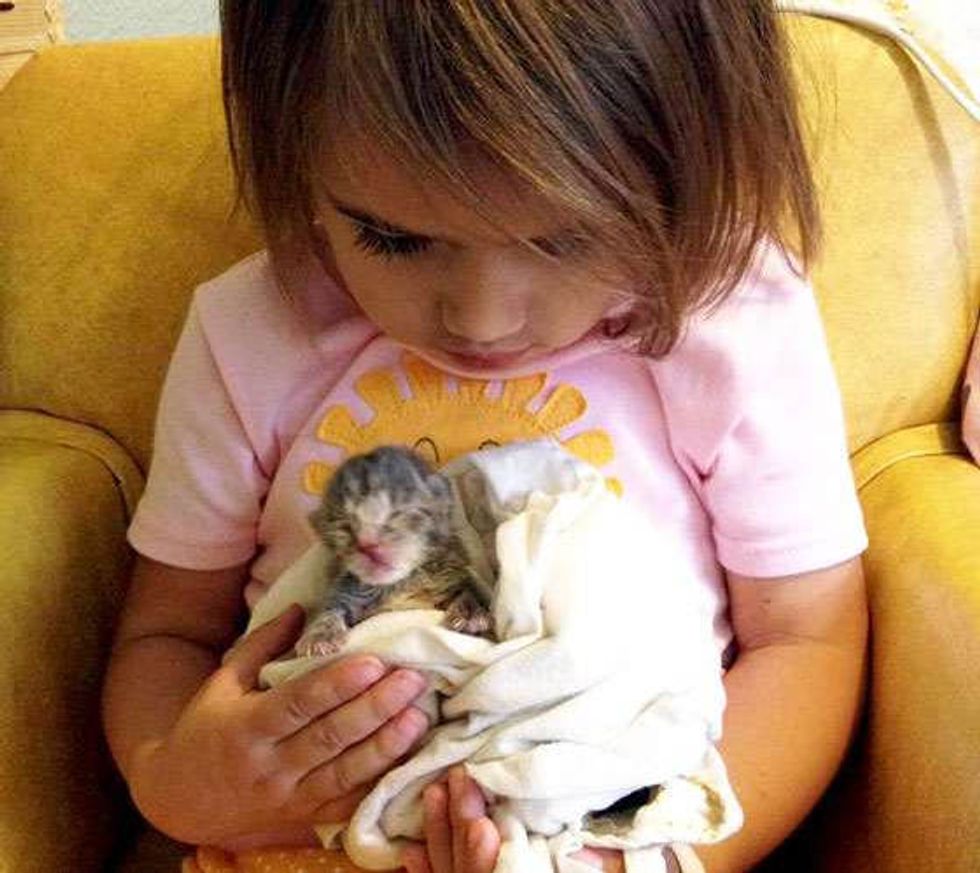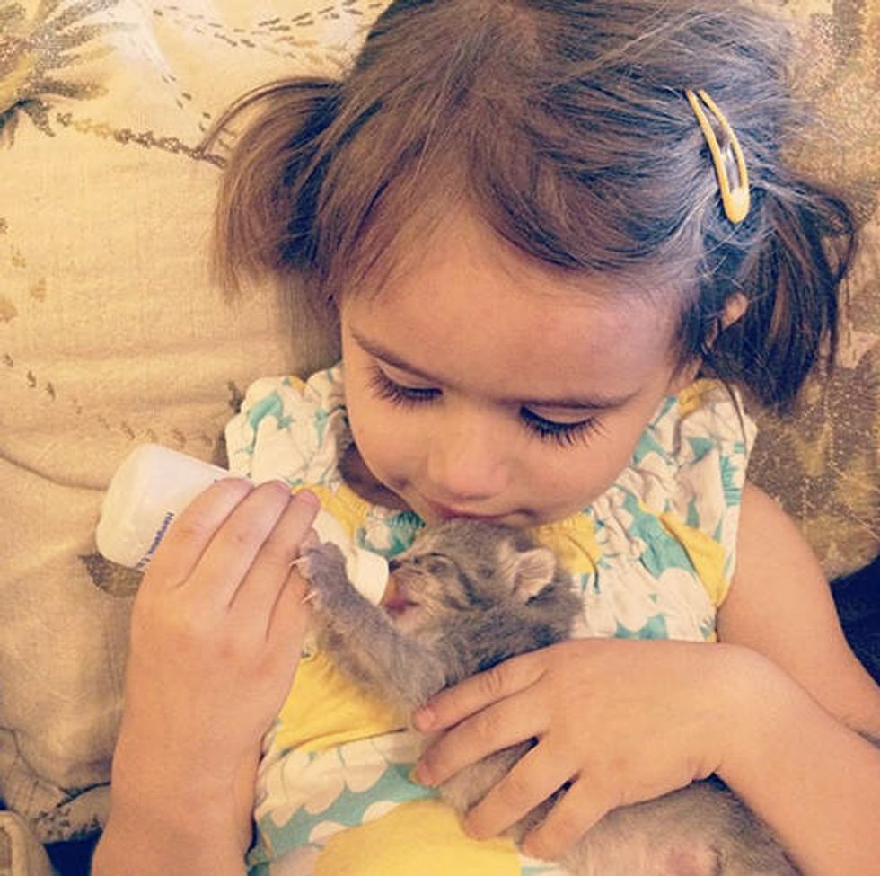 Their daughter Isobel fell in love with the little Squirrelly and offered to help. They taught Isobel to bottle feed the little one and she became a big help for her mother while her mother worked around the clock to nurse the kitten back to health.