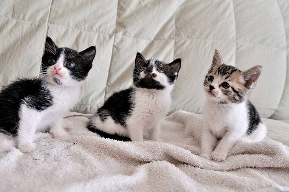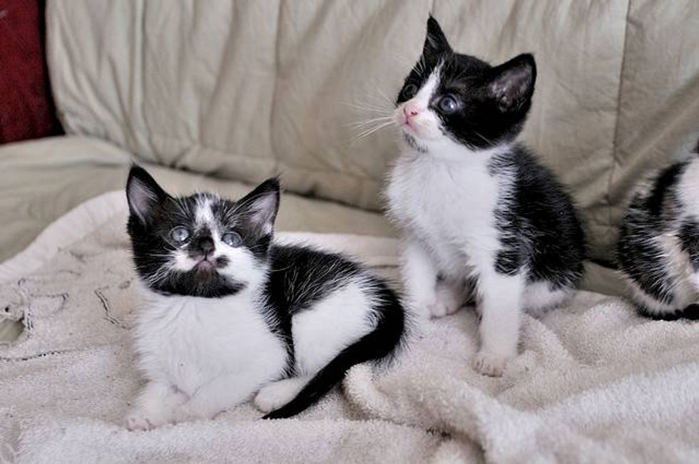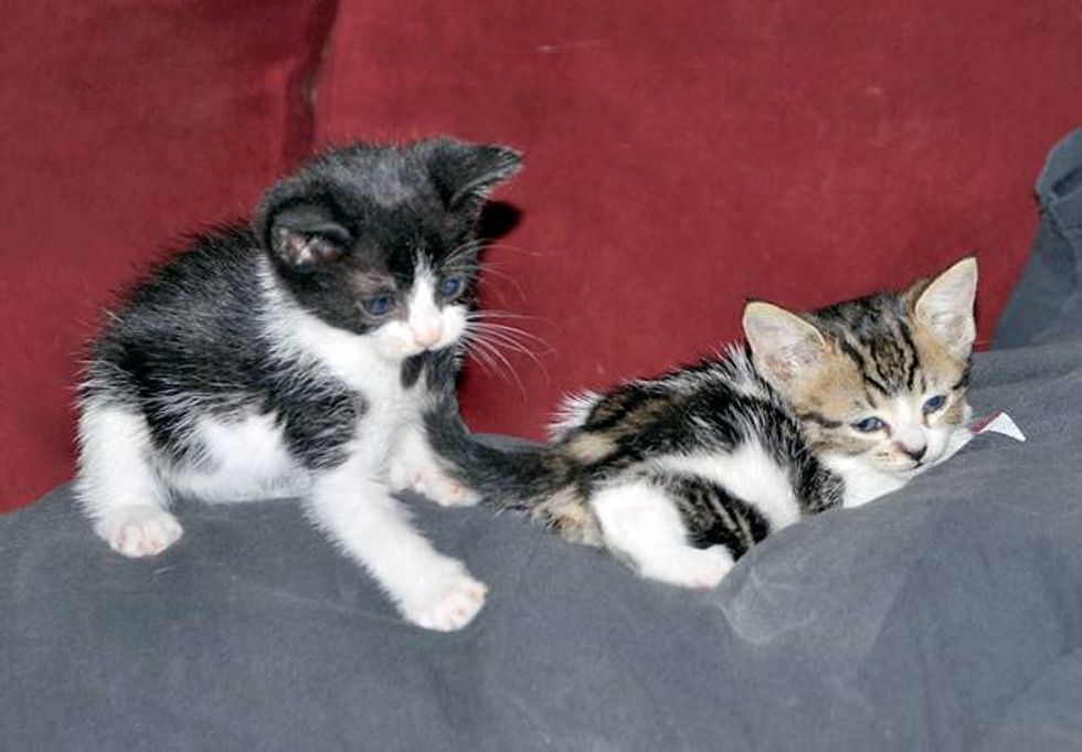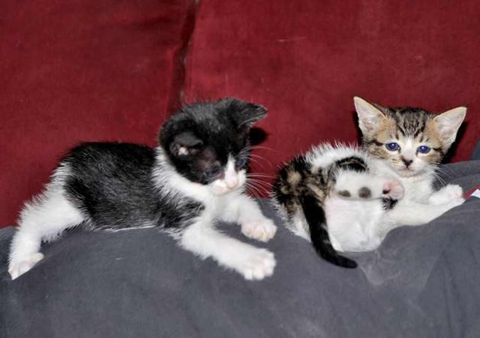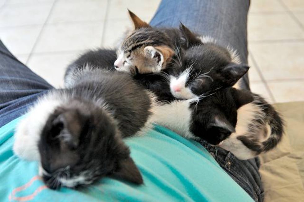 "On their first day with us these little guys were playing and cuddling with us, etc. Just being normal kittens! They were a ton of work at fist, since they were only about 3 to 3 1/2 wks old. They needed frequent feedings, KMR added to their canned food, special litter, a tiny litter box so they could actually climb in it, they were also very uncoordinated so would step in poop and their food and track stuff all over, so they needed their enclosure cleaned twice a day, litter box scooped constantly to prevent poop tracking!, and baths every day or 2. Within about 2 weeks though they turned into more normal coordinated kittens, and it was just pure fun from them on. They were super playful, but also super cuddly. They really were the best kittens! "