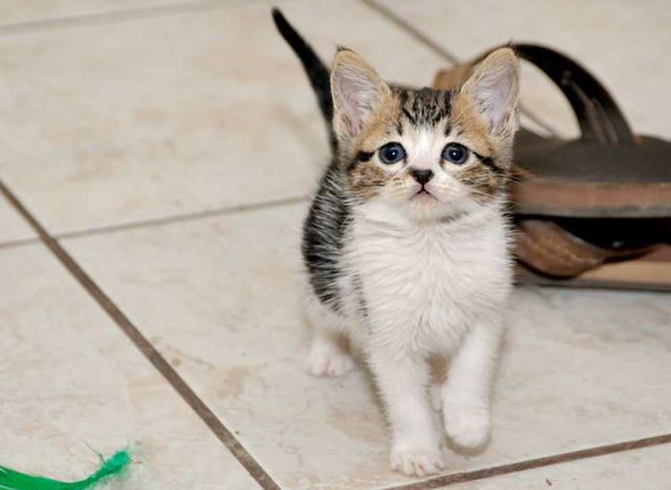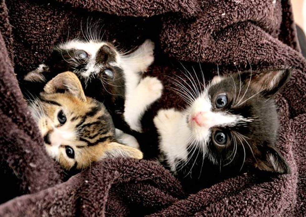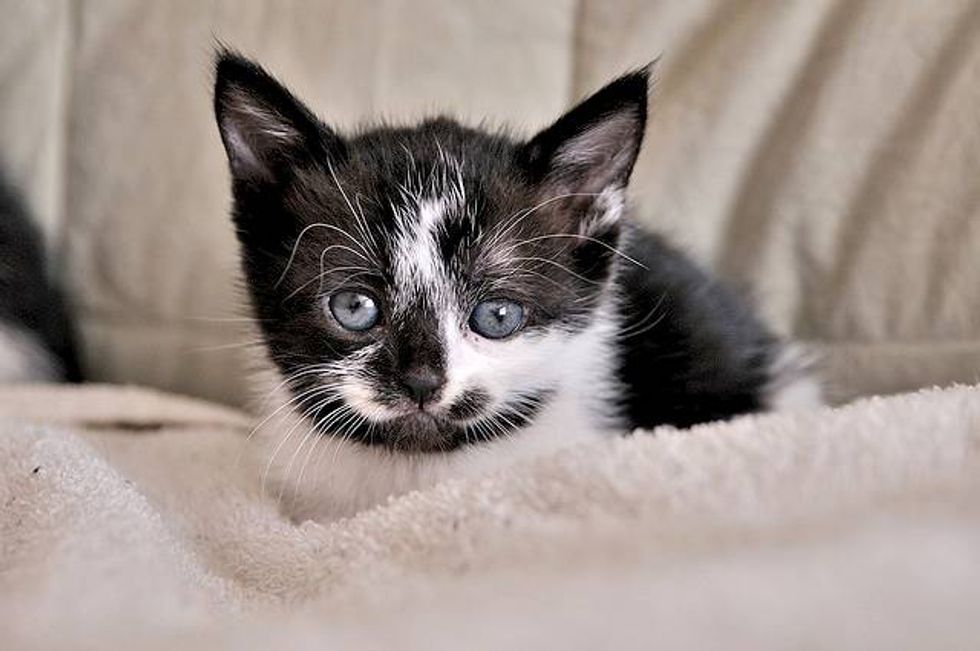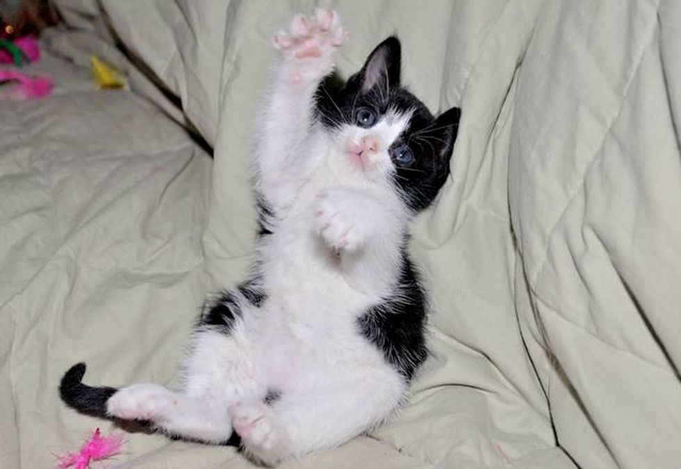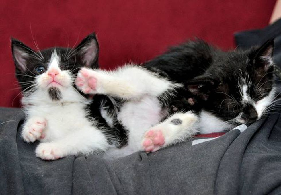 "On their first day with us these little guys were playing and cuddling with us, etc. Just being normal kittens! They were a ton of work at fist, since they were only about 3 to 3 1/2 wks old. They needed frequent feedings, KMR added to their canned food, special litter, a tiny litter box so they could actually climb in it, they were also very uncoordinated so would step in poop and their food and track stuff all over, so they needed their enclosure cleaned twice a day, litter box scooped constantly to prevent poop tracking!, and baths every day or 2. Within about 2 weeks though they turned into more normal coordinated kittens, and it was just pure fun from them on. They were super playful, but also super cuddly. They really were the best kittens! "