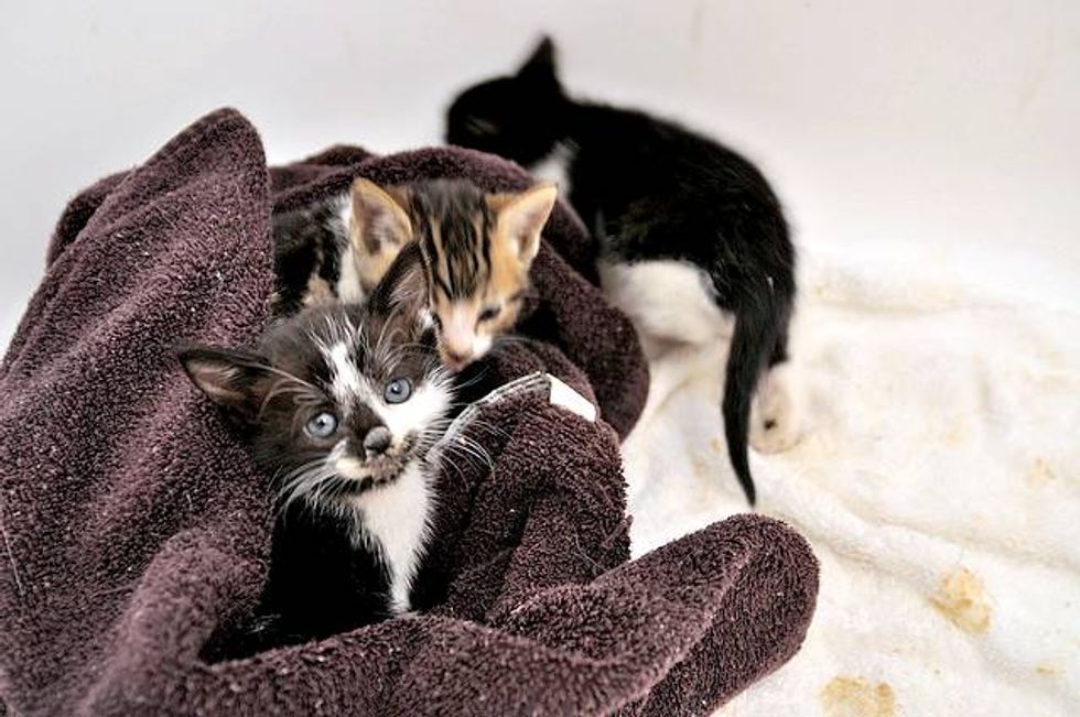 "The 3-wk old kittens were the most fun I've ever had in my life. It was a little tricky catching them, but once we lured them out from hiding we just had to pick them up--they were too small to be dangerous. They were VERY angry at first, but after giving them a plate full of warm kitten milk replacer, they were happy as clams! It literally only took minutes before they were comfortable with us. That is the good thing about catching feral born litters as early as possible. Before about 4-5 wks of age, they are open to anything. Once they reach 6-8 wks, they are much more difficult to socialize and have already developed fear of the unknown--i.e. humans and home life," said Margaret.
