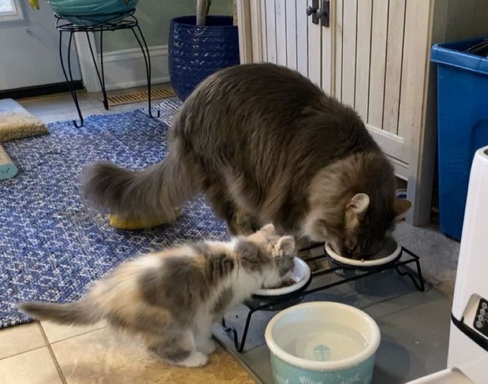 Beast showed the kittens how to eat from a bowl like a big kitty. Flower the little calico followed suit and tried to mimic his every move.