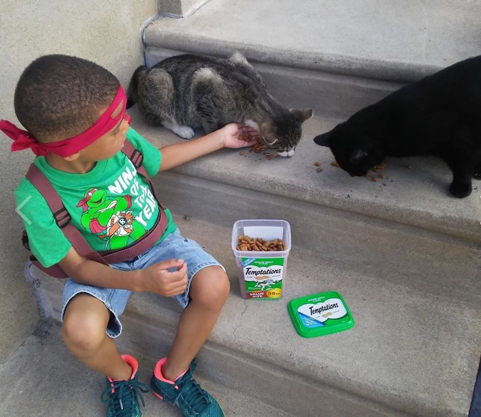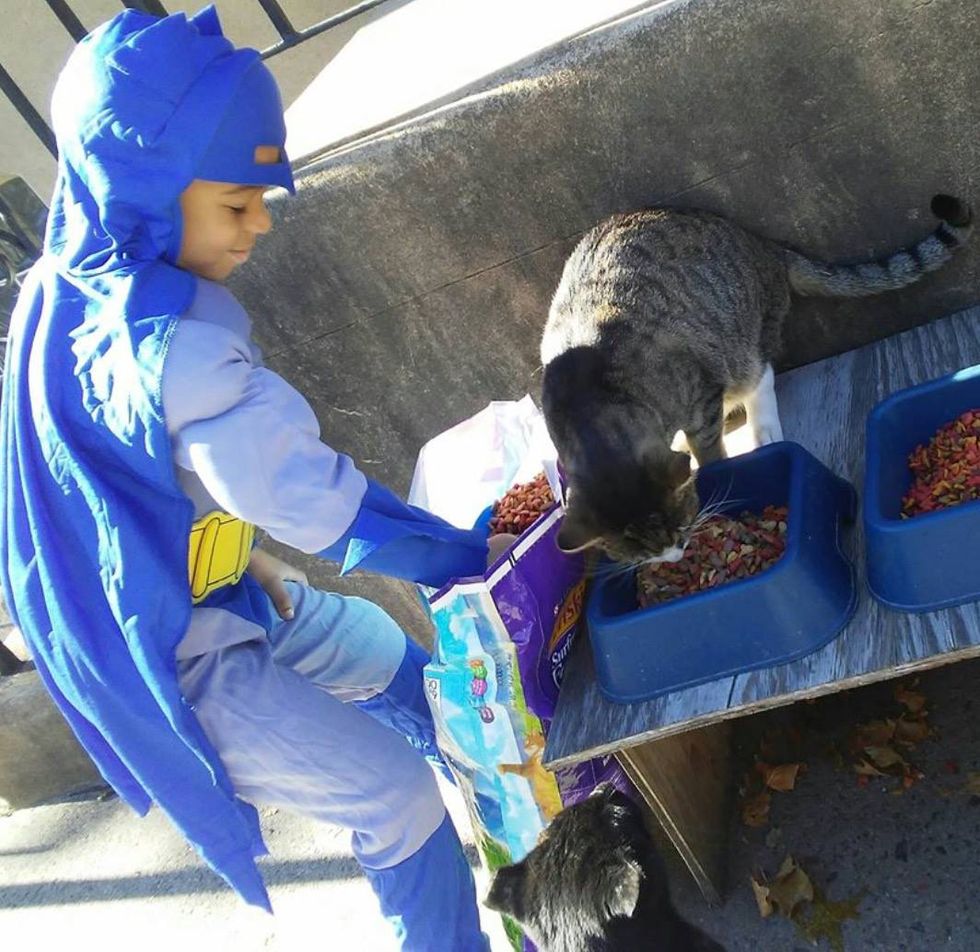 "We feed them and provide them with water, twice a day. Our nephew Shon started showing interest in helping us feed and care for the Kats about two years ago. At that time he was three years old," Kris told Love Meow.