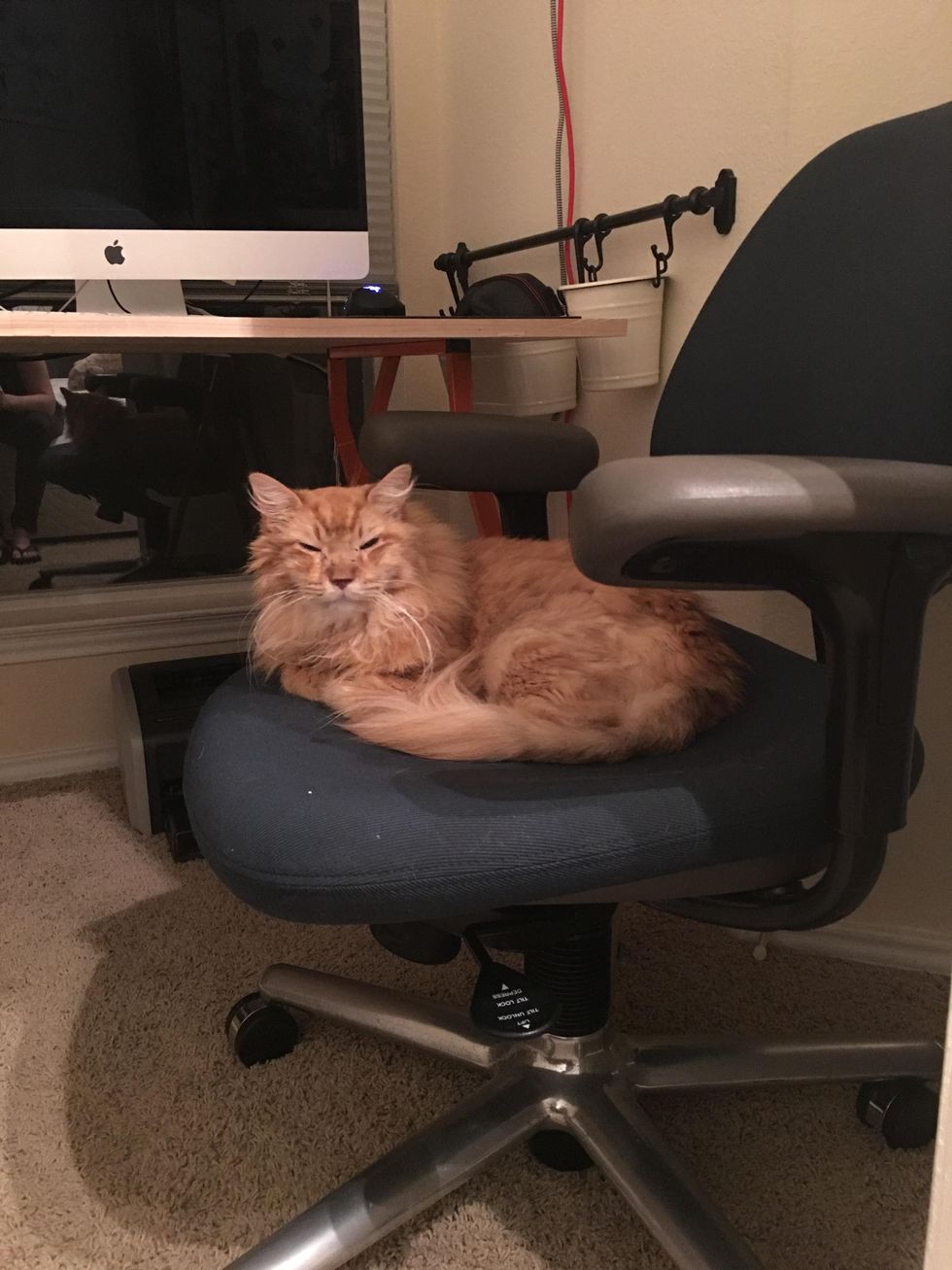 "His favorite spot is my desk chair where he can look out the window at birds and squirrels."